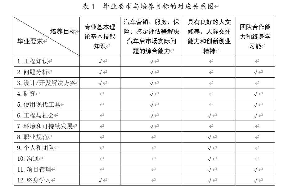 8、职业规范:具有全面发展的素质和良好的人文素养,高度的社会责任感,符合社会主义核心价值观要求,能够在工程实践中理解并遵守汽车服务工程职业道德和规范,履行责任。