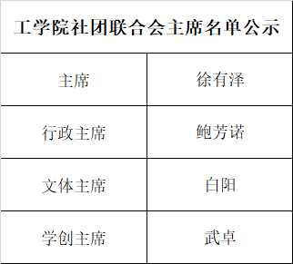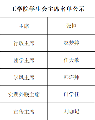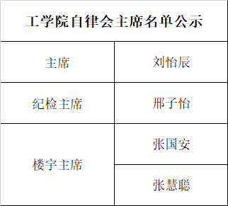 经过评选,工学院学生会、自律会、社团联合会新一届主席团公示名单如下: