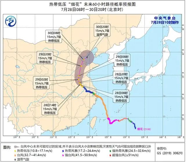 2021年7月28日11时30分,山东省气象台发布台风“烟花”风雨影响最新预报。27日18时至28日11时,全省共有73县(区、市)、1041乡镇出现降水,平均降水量8.0毫米。目前山东降水回波主要位于菏泽、济宁、枣庄、临沂、日照、泰安、济南、淄博等地,过去1小时最大降水量为临沭石门站14.9毫米。山东省气象台11时继续发布台风蓝色和暴雨橙色预警信号。