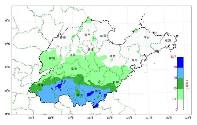 受台风“烟花”影响,昨天夜间到今天上午,鲁南地区出现中到大雨局部暴雨并伴有雷电,鲁西北和鲁中地区出现雷阵雨,鲁东南地区和黄海中部出现阵风7~8级的东北大风。27日18时至28日11时,全省共有73县(区市)、1041乡镇出现降水,平均降水量8.0毫米(图2),折合水量约12.6亿方。各市平均(毫米):枣庄31.2济宁27.3临沂25.5菏泽25.2日照4.4泰安2.4,其他市不足1或无降水。超过50.0的有32个站,25.0-50.0的259个,10.0-25.0的139个,排在前3位的是:济宁嘉祥马集62.7临沂临沭玉山62.2临沂兰陵车辋61.3。