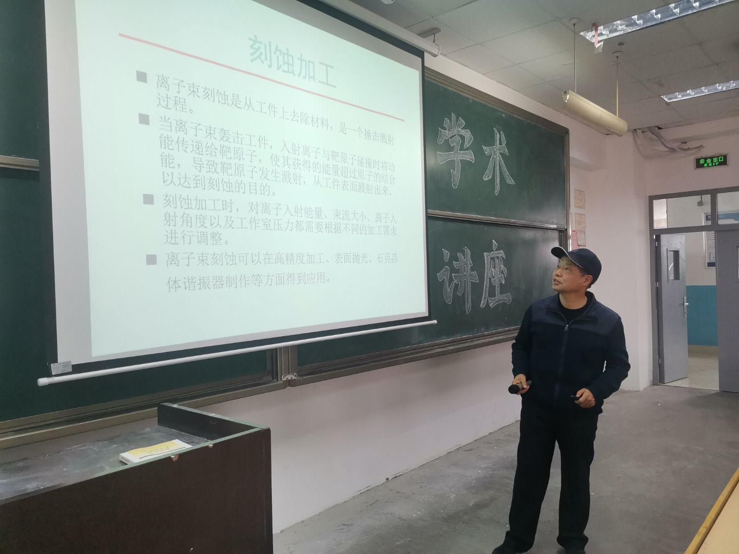然后蔡教授对刻蚀加工、刻蚀加工应用、溅射镀膜加工、硬质膜磁控溅射、固体润滑膜的镀制、薄壁零件的镀制、离子镀加工、离子注入加工进行解释、电解加工具有加工范围广、生产率高、表面质量好、加工过程中不存在机械力、所以不会产生由切削力引起的残余应力和变形、没有毛刺、阴极工具在理论上不损耗、基本上可长期使用的特点,随后又对半导体、化合物半导体、抗水溶液腐蚀、抗高温氧化、电子束热加工、离子束加工、喷气发动机燃烧室罩打孔、化纤喷丝头打孔、人造革气孔打孔的概念及应用进行了解释说明。