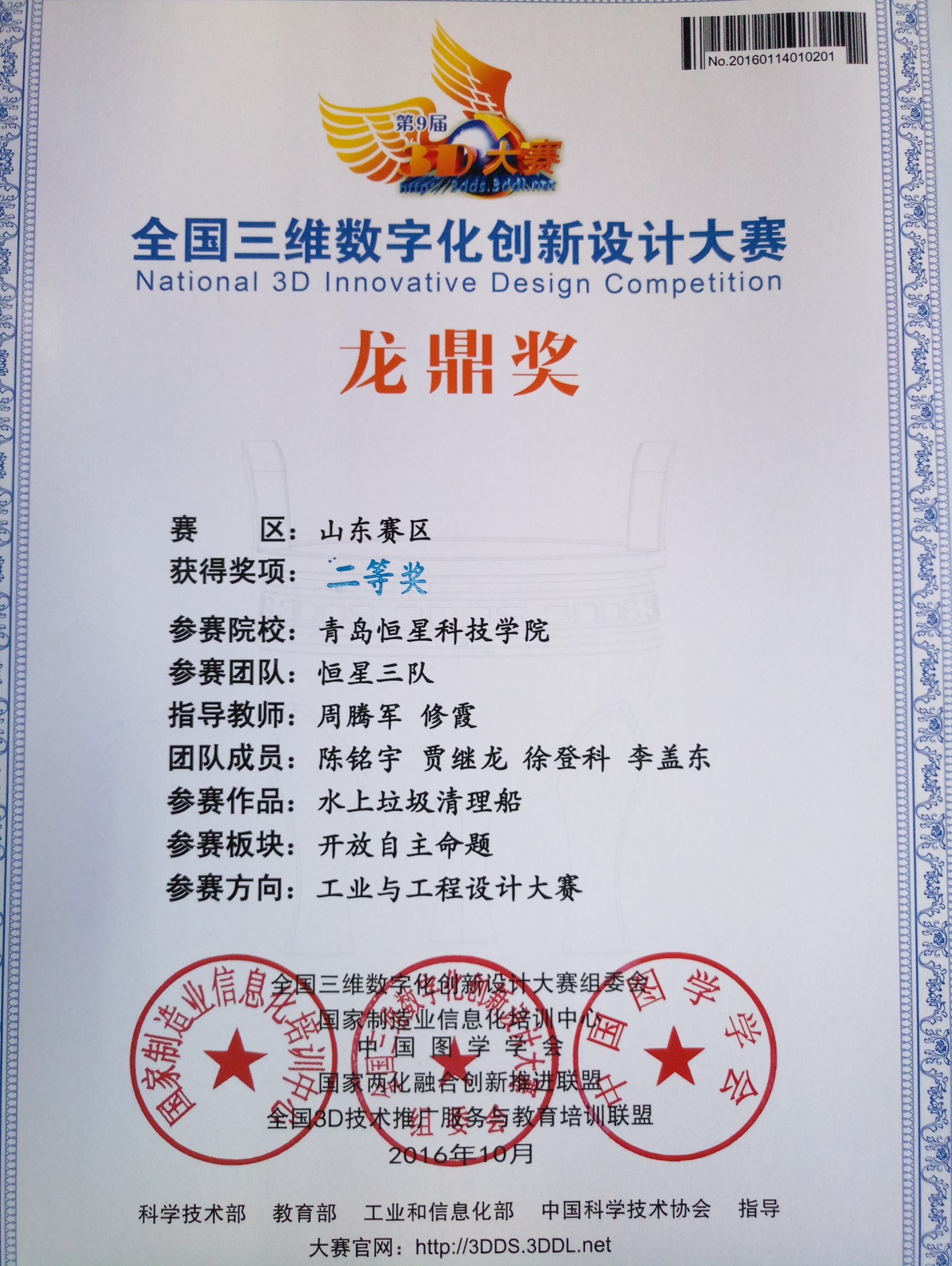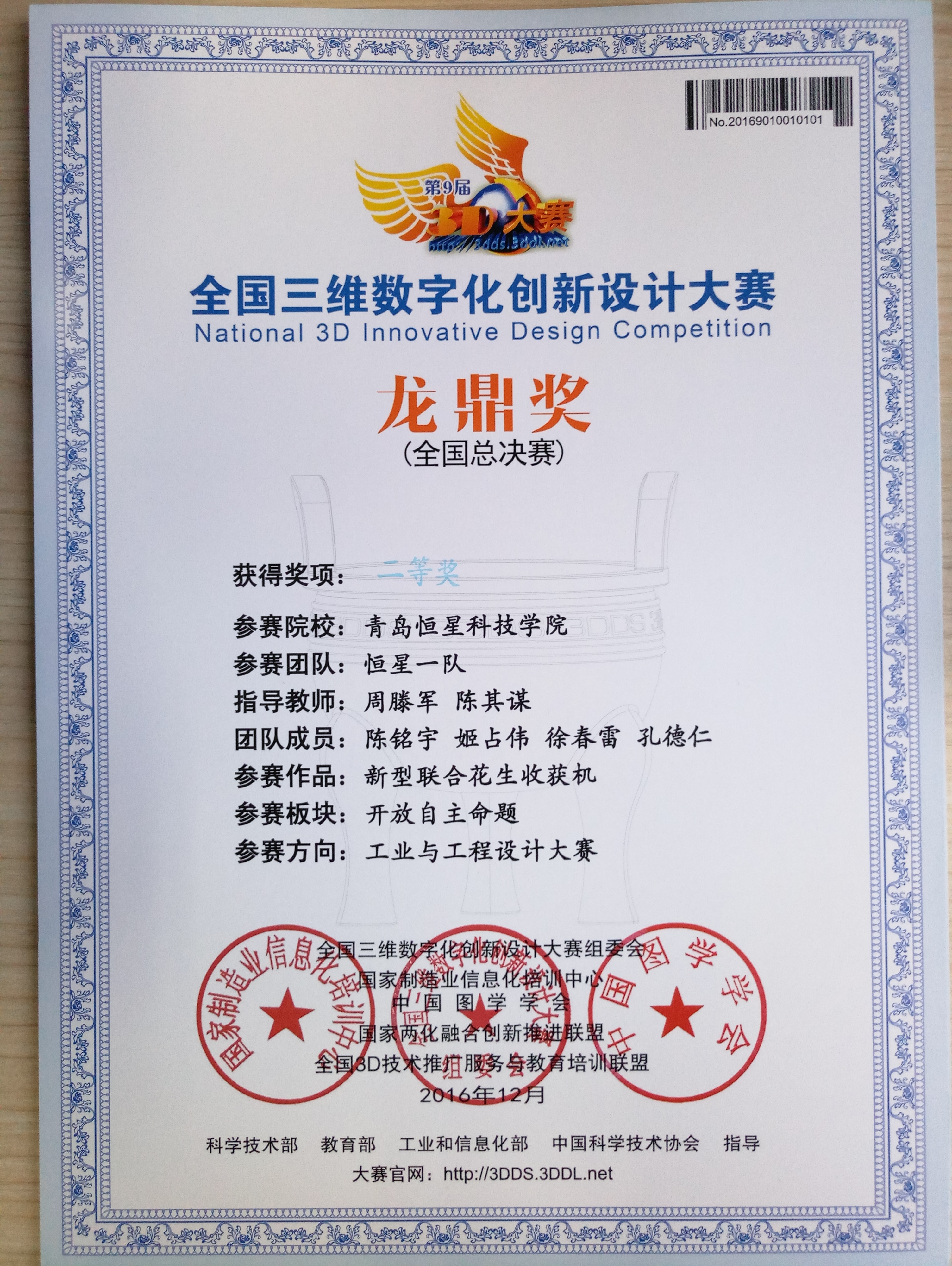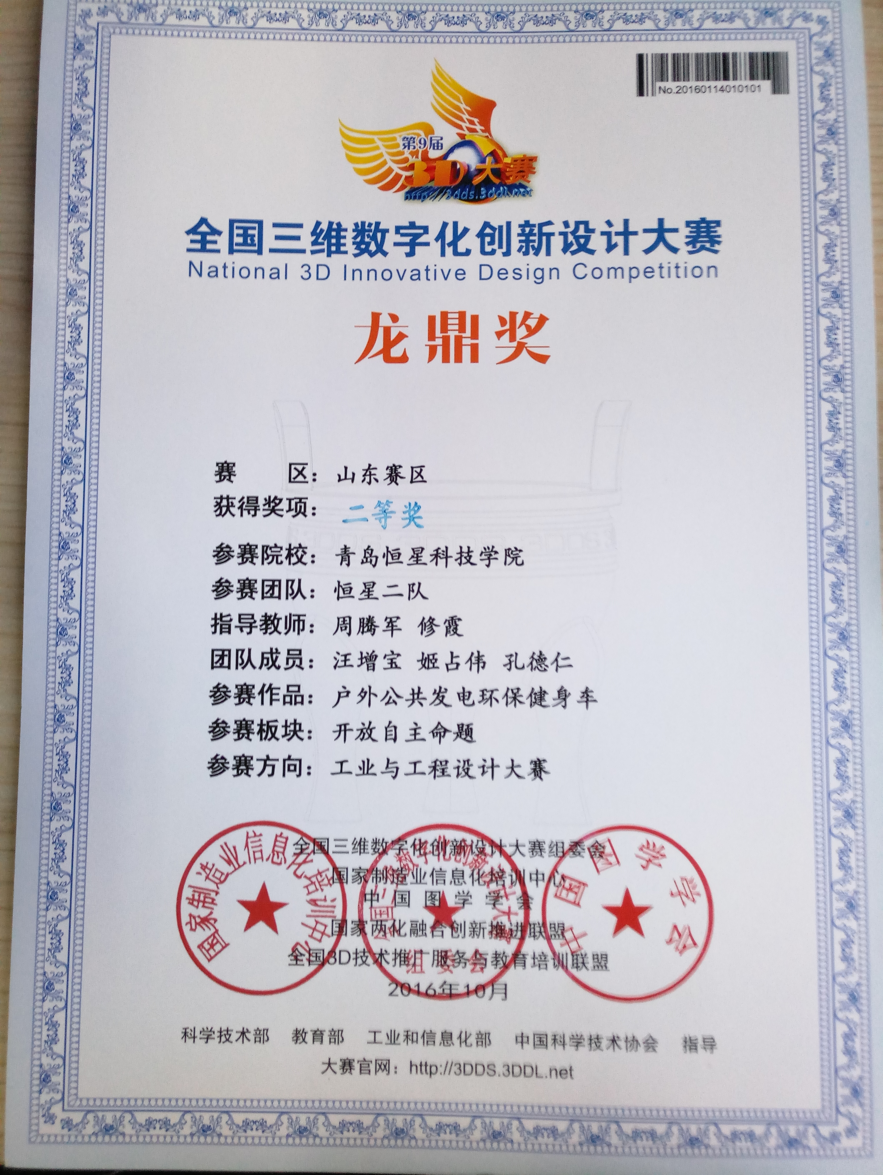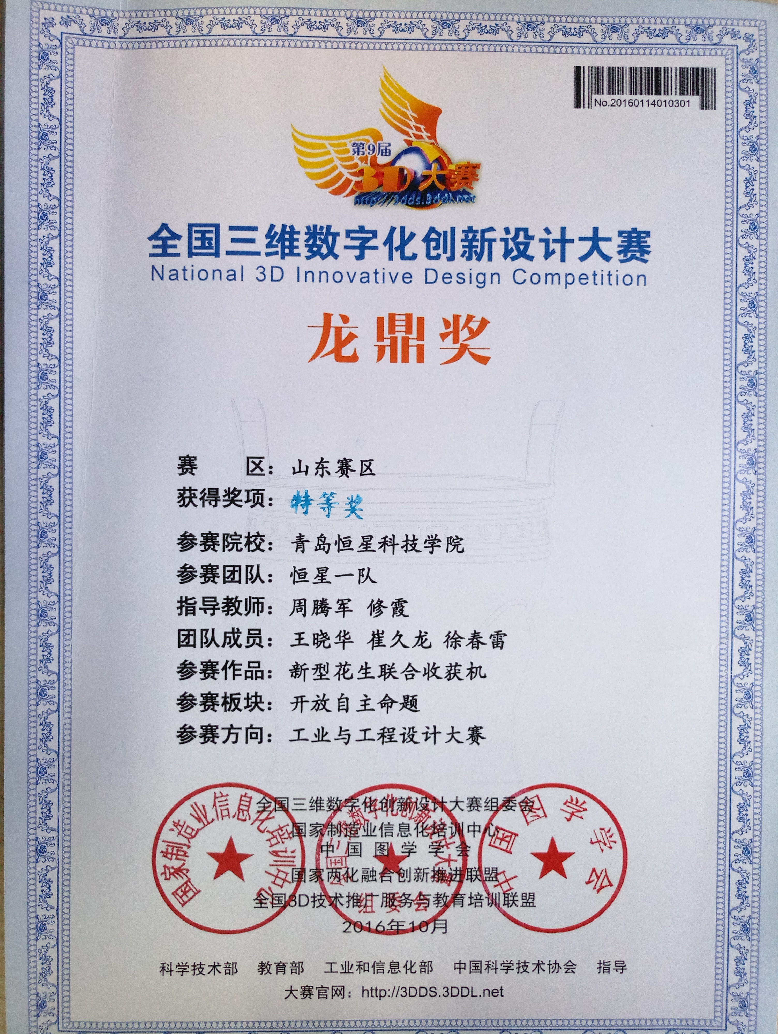 全国三维数字化创新设计大赛获奖证书