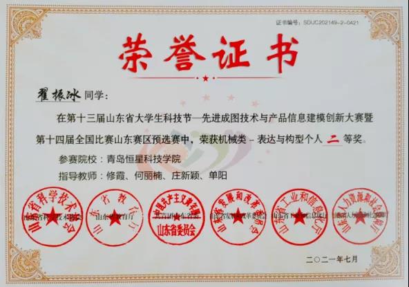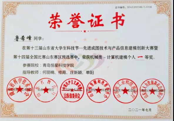 赛后由工学院机械工程专业带头人张明、教学助理修霞、机械工程教研室任课教师谭云安和何丽楠老师对大赛作品进行了评价打分,共评出一等奖获得者6名,二等奖获得者9名,三等奖获得者15名,优秀奖获得者15名,并选拔出一二等奖获得者15名同学参加省内半决赛,以下附获奖名单。