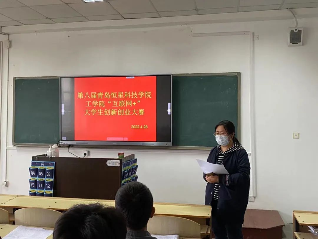 为深入贯彻落实习近平总书记关于教育的重要论述和给第三届中国“互联网+”大学生创新创业大赛“青年红色筑梦之旅”大学生重要回信精神,落实《国务院办公厅关于深化高等学校创新创业教育改革的实施意见》、《国务院办公厅关于进一步支持大学生创新创业的指导意见》等文件精神,全面深化高校创新创业教育改革、提升大学生创新创业能力、加快培养创新创业人才,纵深推进大众创业万众创新,青岛恒星科技学院工学院于2022年4月28日在近思楼809教室举办“互联网+”大学生创新创业比赛答辩。