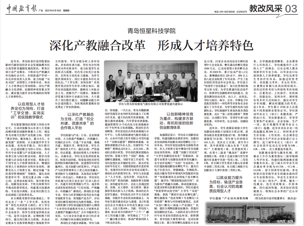8月19日,《中国教育报》以“青岛恒星科技学院‘深化产教融合改革,形成人才培养特色’”为题,对我校在教学改革方面的突出做法进行了报道。