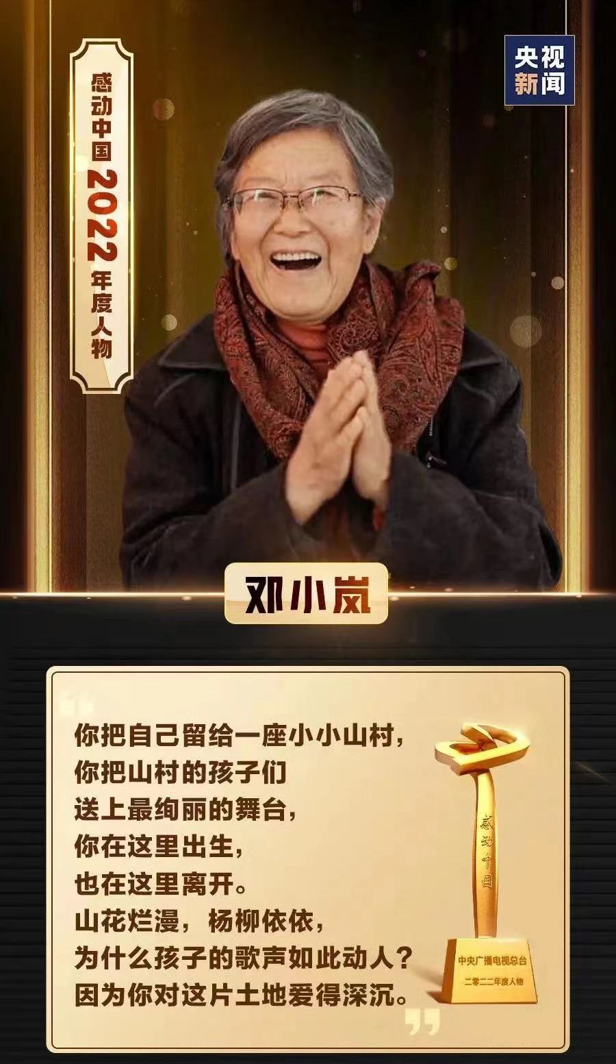 事迹:在2022年北京冬奥会开幕式中,44位来自太行山深处的孩子用天籁之音演唱了希腊语奥林匹克会歌《奥林匹克颂》,这群在鸟巢体育场内唱响世界的孩子们背后,是默默耕耘十余载,无私奉献的音乐教育志愿者老人邓小岚(邓拓之女)。十几年来,每年数十次往返于北京和地处太行山深处的马兰村,为改善当地孩子的读书环境,让山里的孩子感受音乐的美好而尽自己的一份爱心努力。