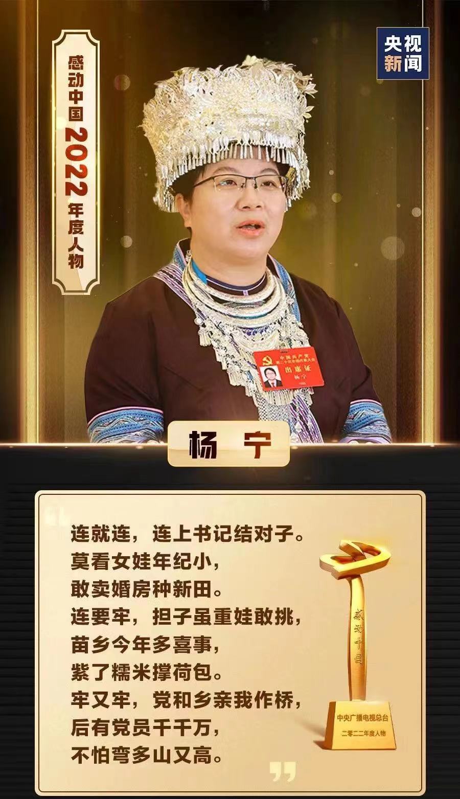 事迹:“留在城里,还是回到小山村,这是一次艰难的抉择,我彻夜难眠。大苗山养育了我,或许我可以为改变家乡的贫困面貌出一份力呢?”2010年7月,大学毕业的杨宁在收到南宁市一家农资公司录用通知的同时,也了解到家乡正在选聘大学生村官。几经思考,杨宁下决心回村里当一名大学生村官。十多年后,从穷乡僻壤的深山苗寨,到如今瓜果飘香的美丽乡村……看着家乡的巨变,杨宁觉得一切辛苦付出都是值得的。“我无悔当初回乡的选择,农村广阔天地真的大有可为。”杨宁说,希望能有更多的年轻人到农村来,有人才才有更美好的未来。