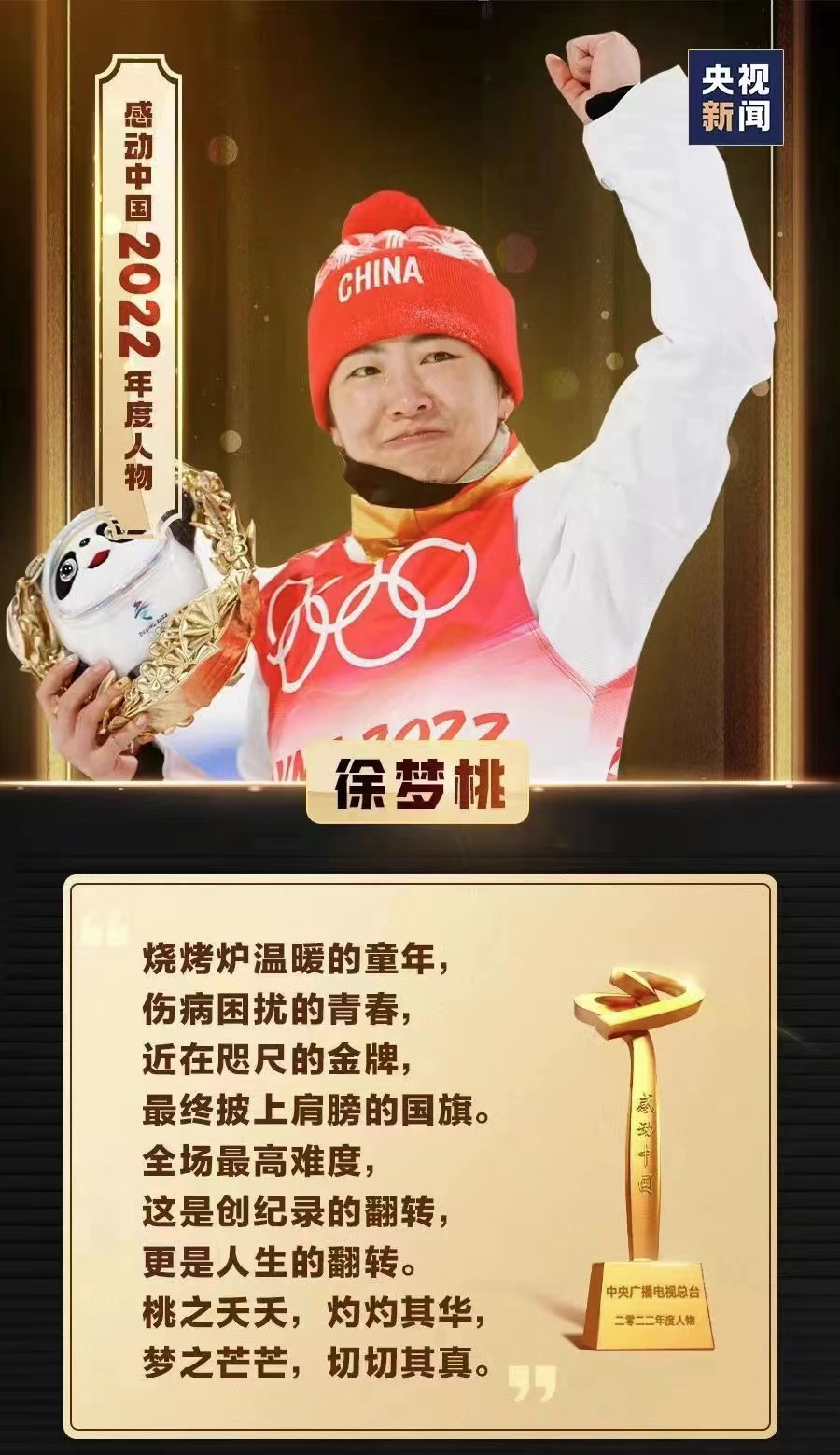 事迹:徐梦桃,中国自由式滑雪空中技巧女队队员。2013年,徐梦桃获得挪威世锦赛自由式滑雪空中技巧赛冠军;次年获得2014年索契冬奥会自由式滑雪空中技巧赛亚军 ,这也是她个人冬奥会历史上的第一枚奥运奖牌。截至2022年10月,徐梦桃共获得世界杯奖牌57枚(其中金牌34枚),拥有世界第一的难度动作,总积分排名世界第一;是世锦赛奖牌最多运动员(5枚金牌)、女子最高得分纪录保持者。2022年2月20日,徐梦桃当选北京冬奥会闭幕式中国代表团旗手11月,获得“2022博鳌青年领袖·青年梦想者”荣誉称号。