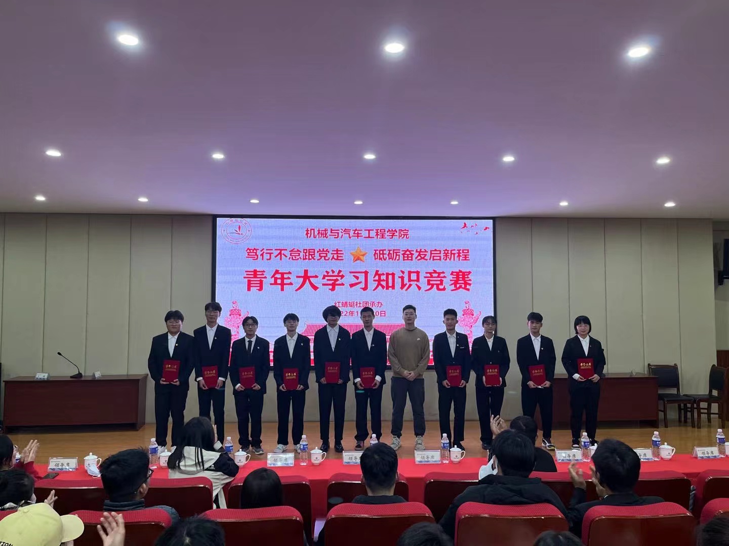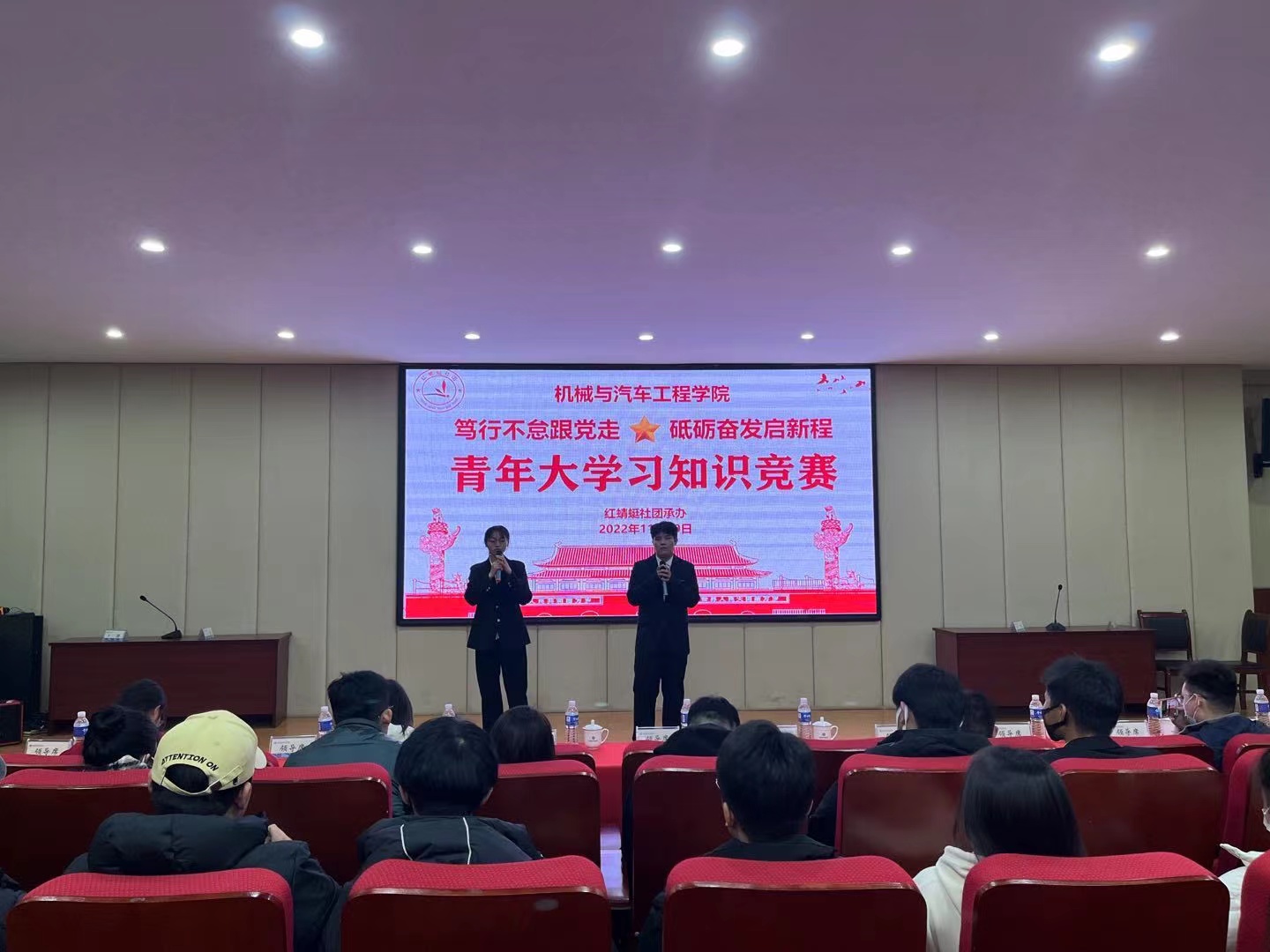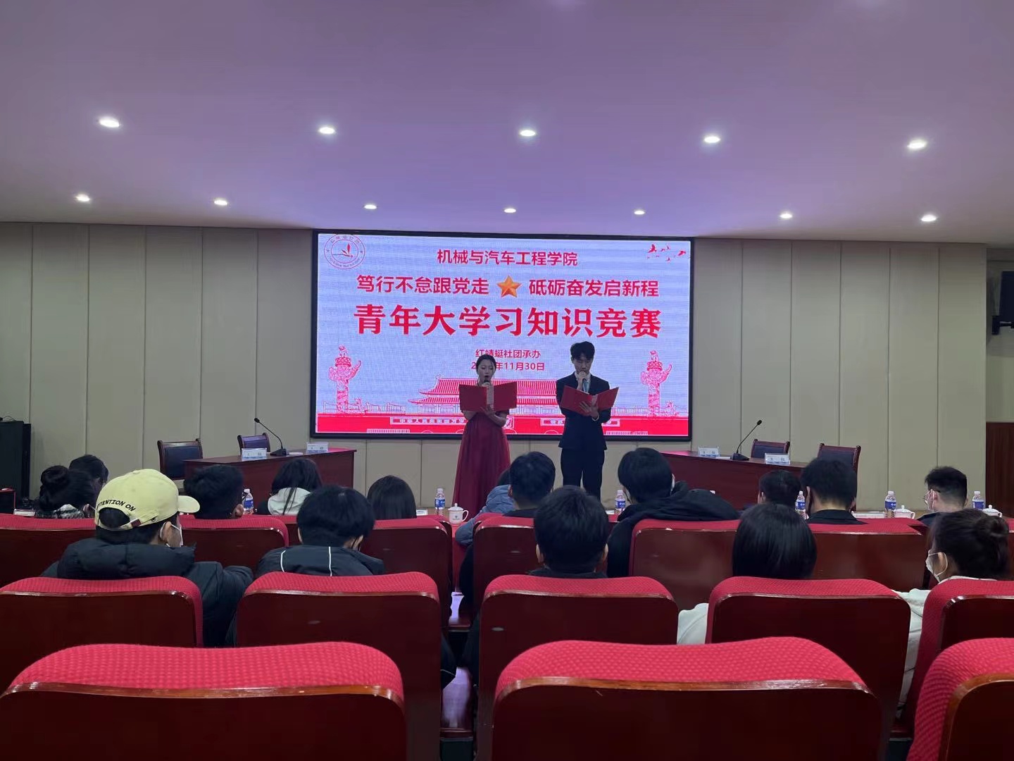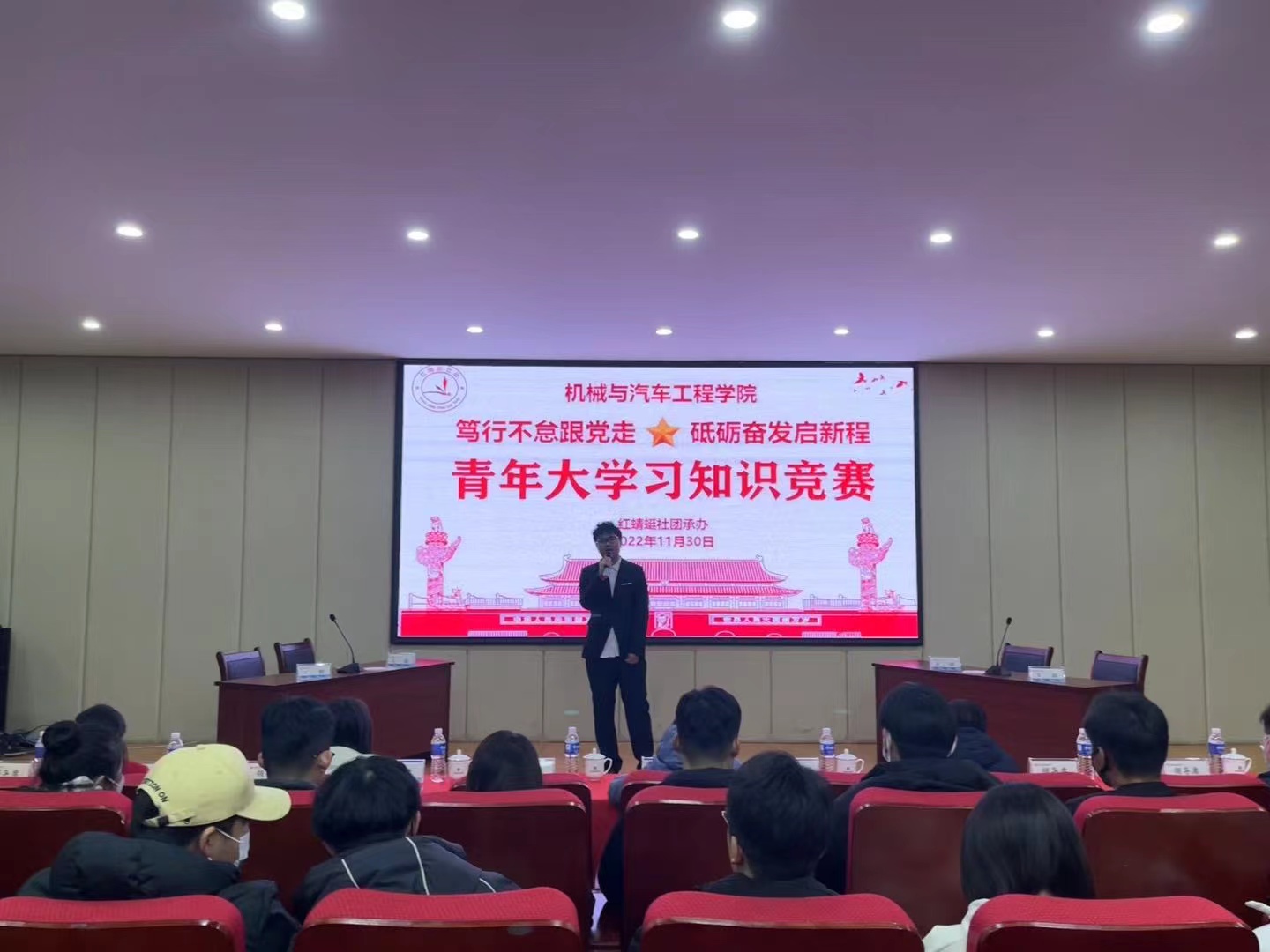 为深入学习贯彻习近平新时代中国特色社会主义思想,全面落实“强国复兴有我”群众性主题宣传教育活动要求,深化“青年大学习”网上主题团课知识运用,全面展现青年学生积极向上的精神风貌,机械与汽车工程学院红蜻蜓社团于11月30日19:30在A8-110举办青年大学习知识竞赛活动。