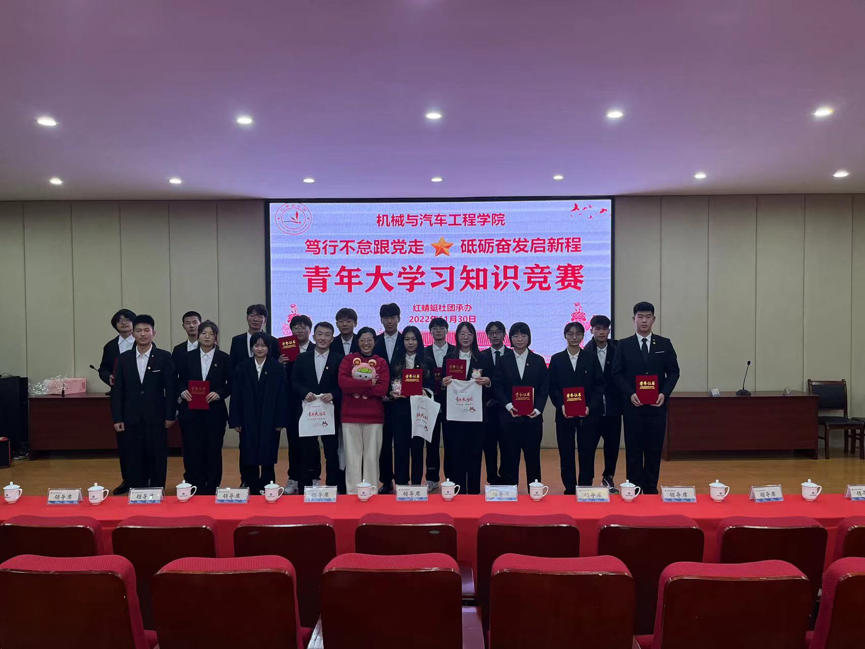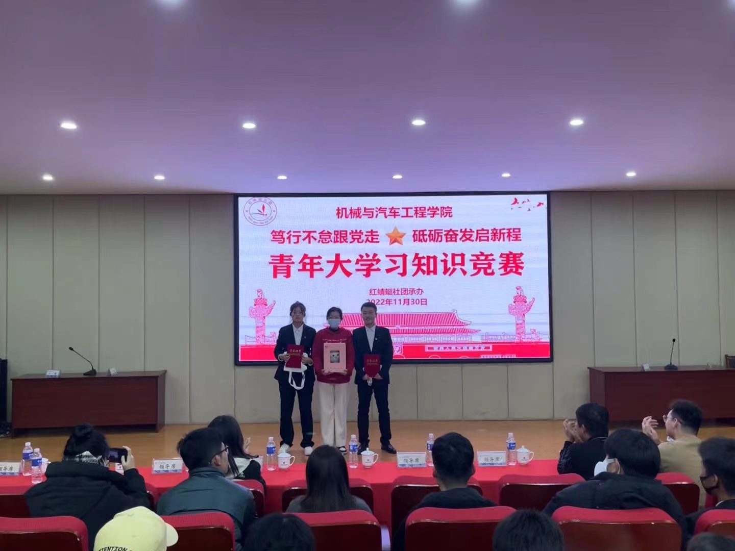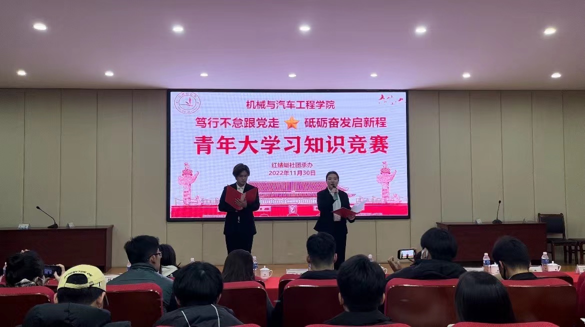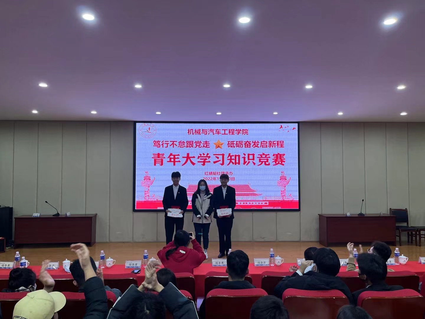 为深入学习贯彻习近平新时代中国特色社会主义思想,全面落实“强国复兴有我”群众性主题宣传教育活动要求,深化“青年大学习”网上主题团课知识运用,全面展现青年学生积极向上的精神风貌,机械与汽车工程学院红蜻蜓社团于11月30日19:30在A8-110举办青年大学习知识竞赛活动。