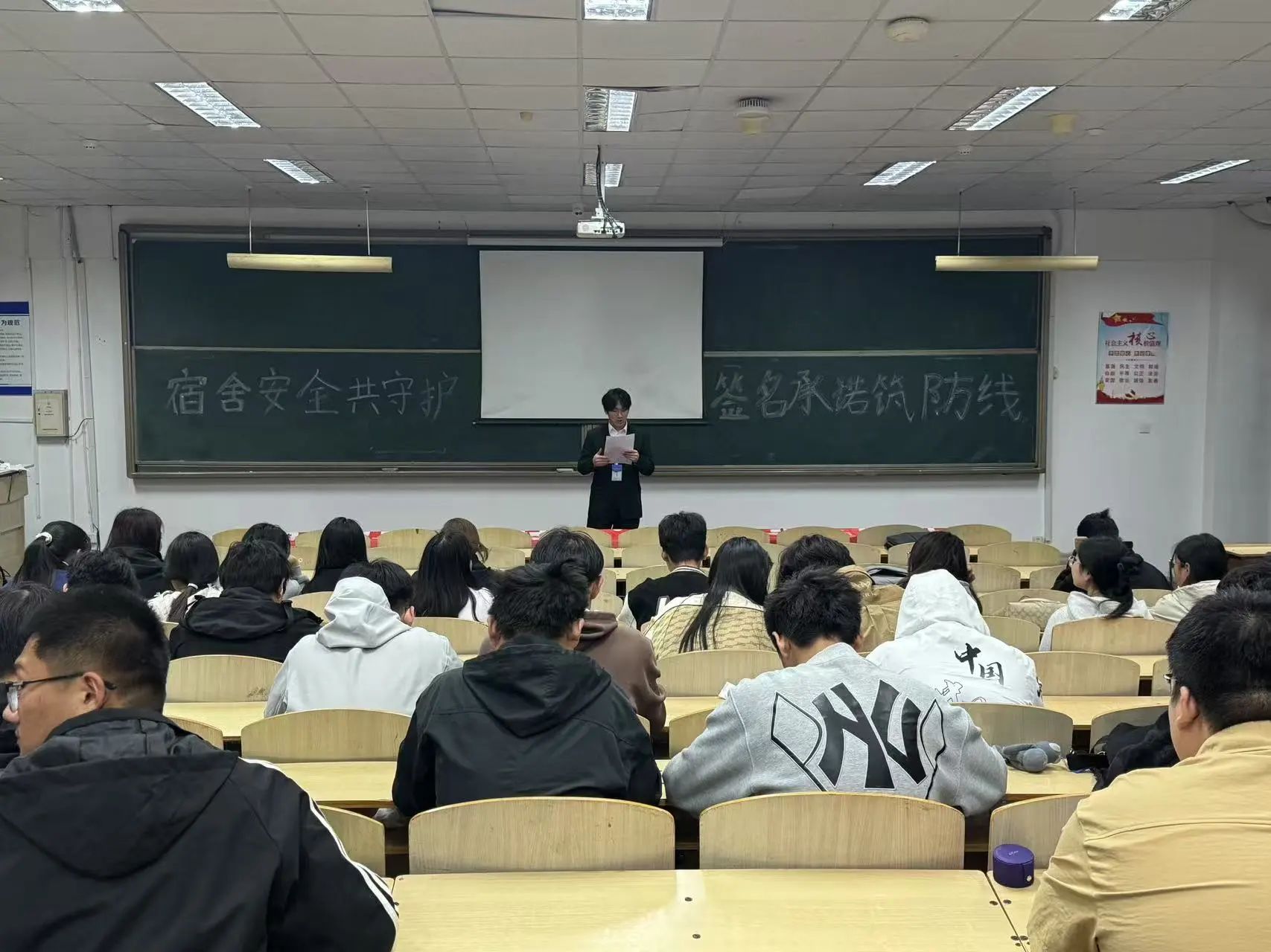 宿舍是我们温暖的小家,安全则是守护这份温暖的前提。为强化同学们的消防安全意识,2025年4月24日,机械与汽车工程学院在A4-802开展了以“宿舍安全共守护,签名承诺筑防线”为主题的活动。