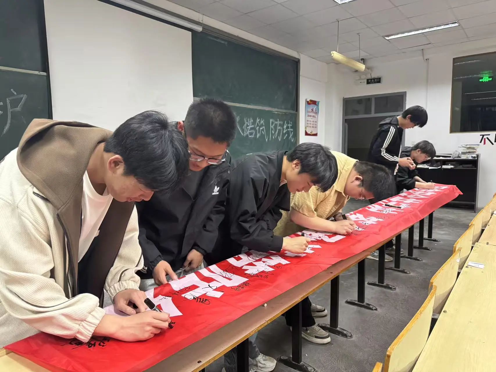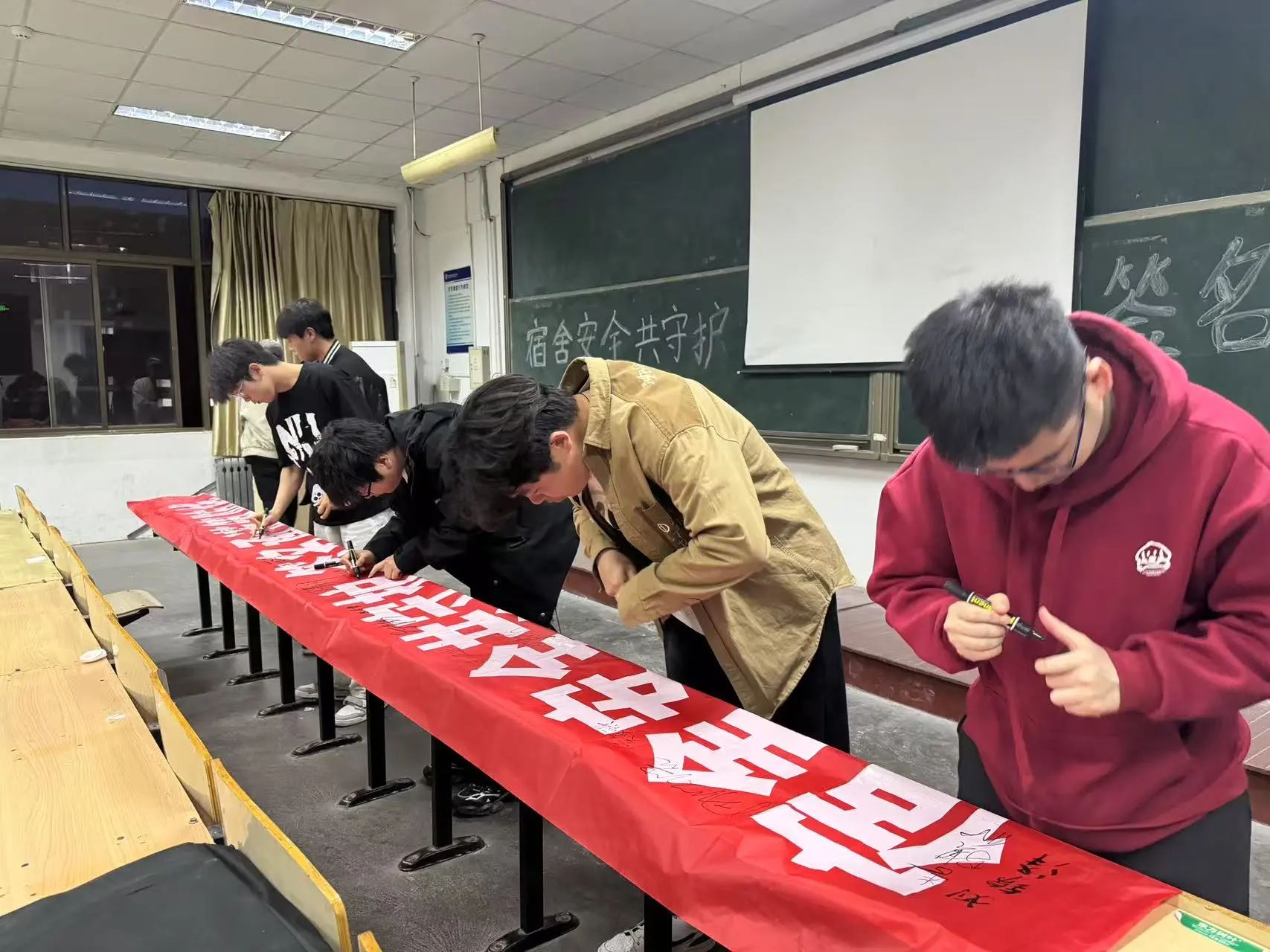 最后,所有同学共同拉起横幅进行合照,并一起喊出“宿舍安全共守护,签名承诺筑防线”的活动口号。