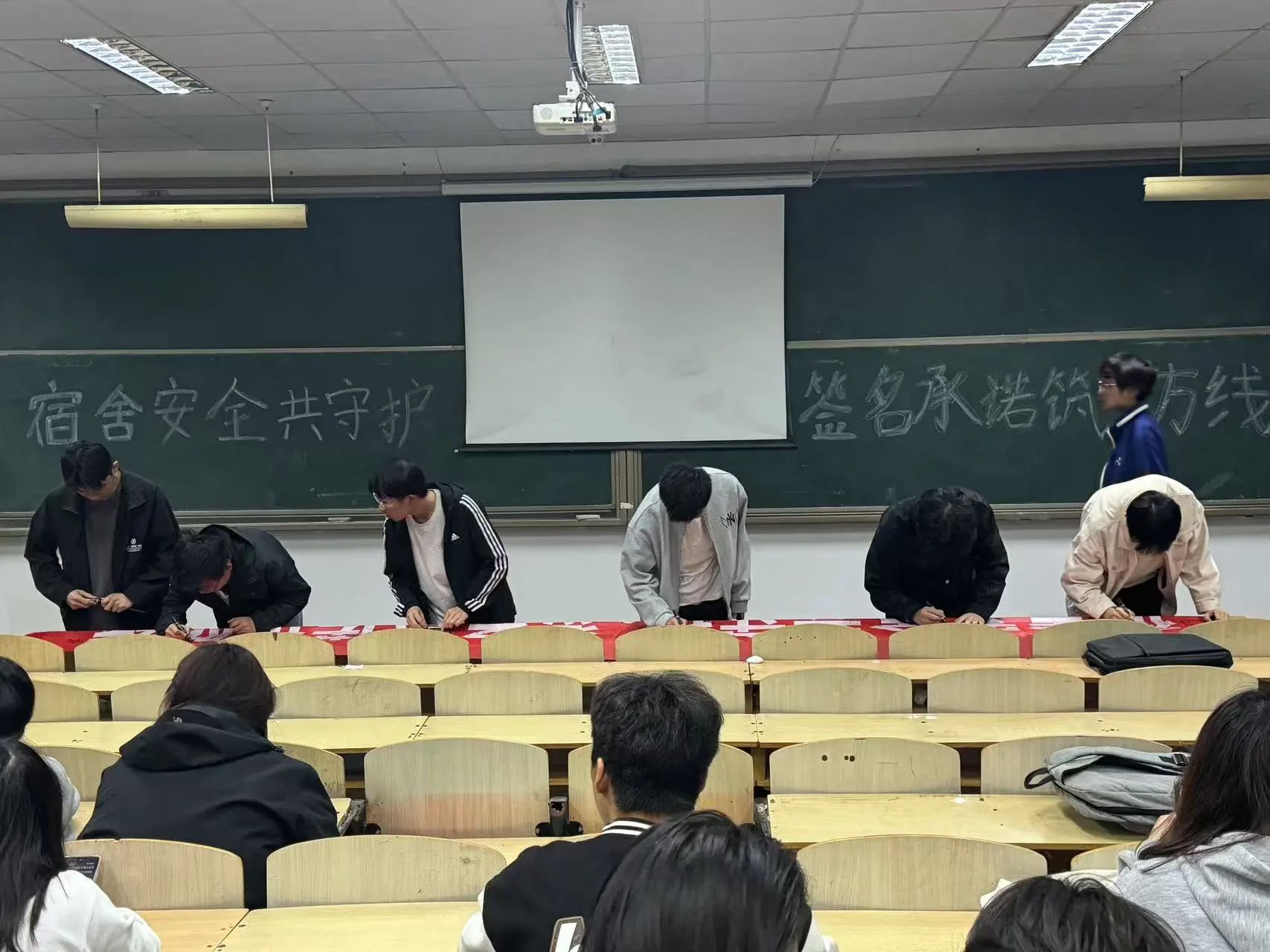 随后在活动负责人的引领下同学们有序移步到横幅前,郑重的签下自己的名字,许下维护宿舍消防安全的庄严承诺。这一笔一划,不仅是个人的承诺,更是大家共同守护宿舍安全的决心体现。