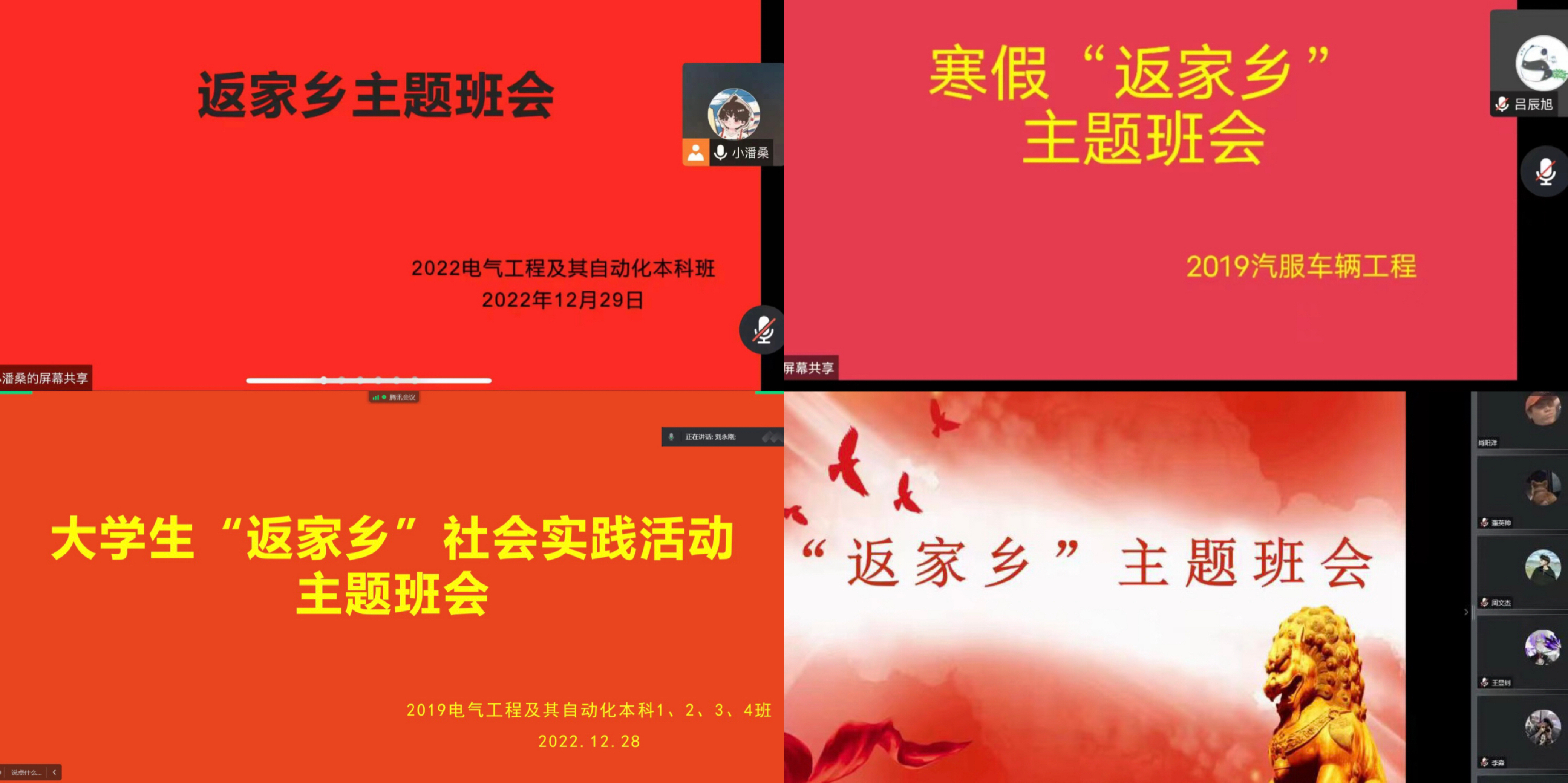 机械与汽车工程学院各班于12月26至28日相继组织并召开了专题线上班会,布置实践任务、要求和动员学生参与返乡实践,并对参与实践学生开展线上会议实践指导、安全教育培训,积极帮助学生与实践所在地团组织建立联系。