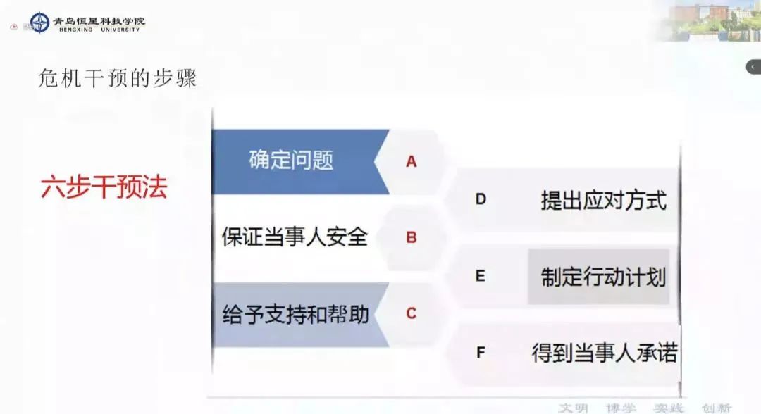 当他人出现心理危机时,我们可以对其使用“六步干预法”,即确定问题、保障当事人安全、给予支持帮助、提出应对方式、制定行动计划、得到当事人承诺。
