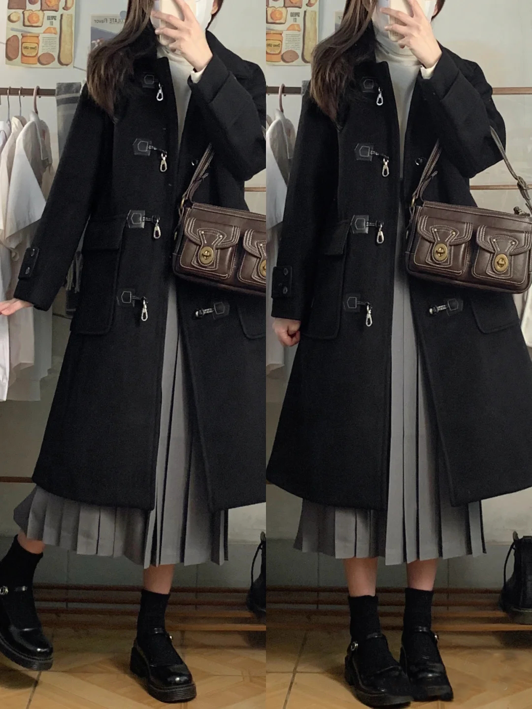 深灰的宽松连衣长裙搭配黑色的中长外套,这样穿在冬季特别受欢迎,搭配小皮鞋显得随性又大方。女生在冬季很适合这样穿搭,不仅能提升你的气质,同时也不会显得你过于成熟。