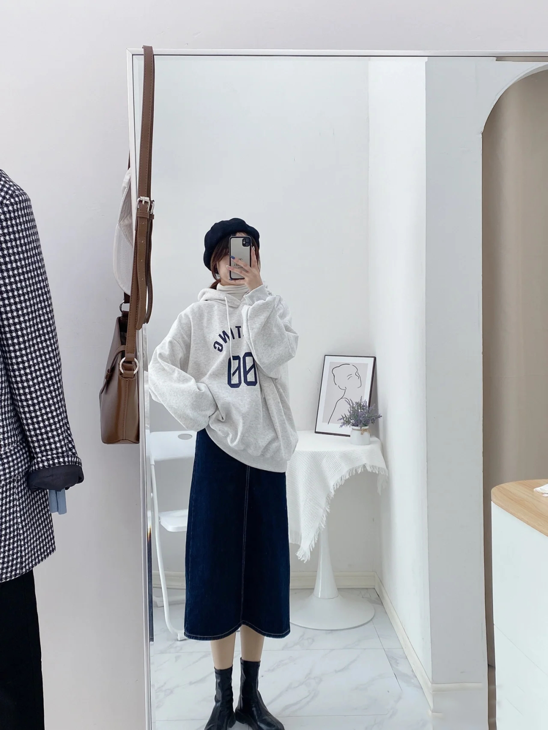 白色的高领内搭加上宽松卫衣,再搭配黑色半身中长裙,这样穿不仅淑女时尚且有着休闲的味道。卫衣搭配裙子也是冬季很受欢迎的穿搭之一,再配上黑色的皮鞋露出中袜,更添时尚指数。