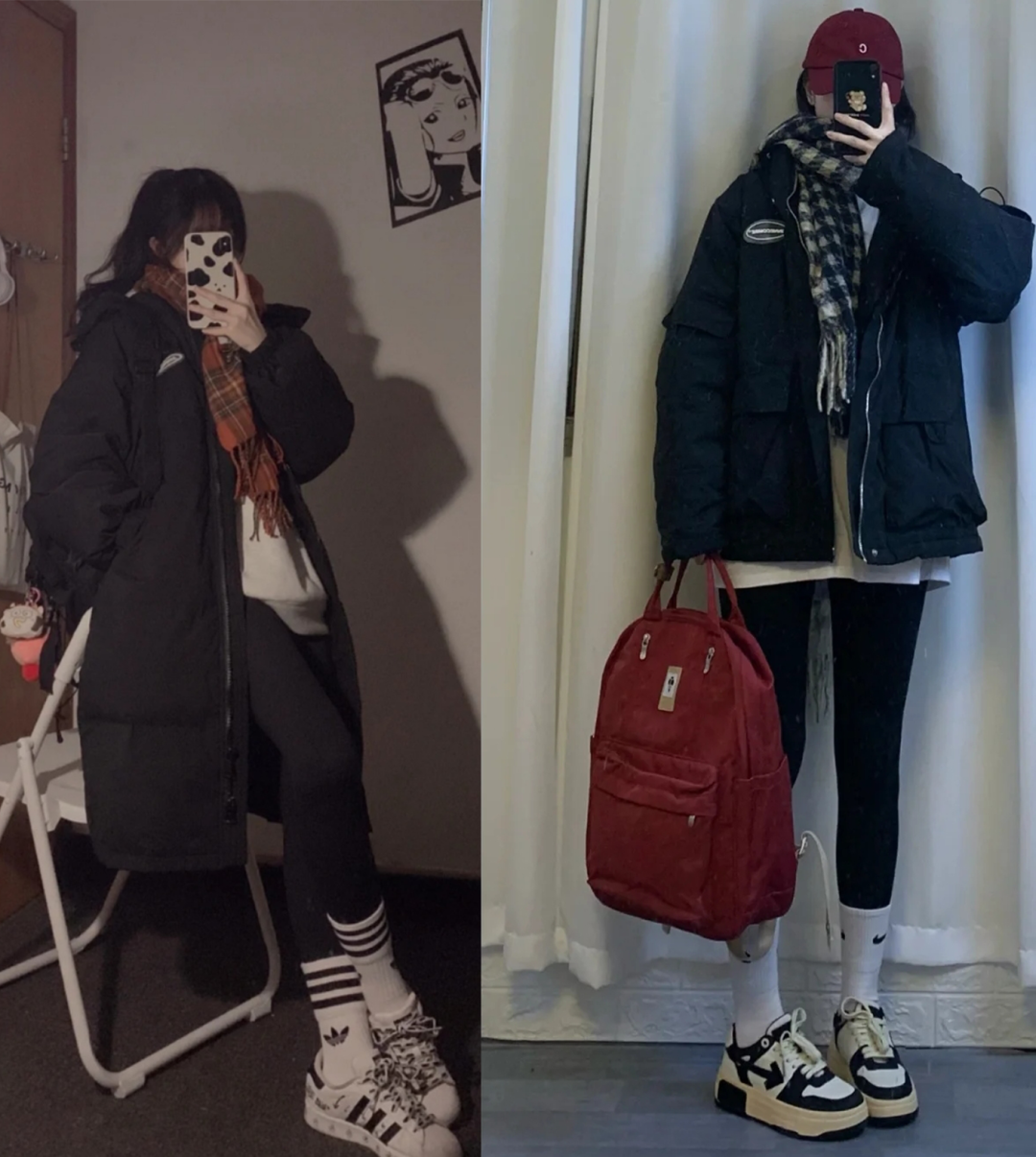 白色的宽松卫衣作为打底,外面配上黑色羽绒服,下身搭配黑色紧身裤,这样穿给人满满的运动休闲风,搭配运动鞋或板鞋露出中袜看起来很有范儿。女生在冬季也可以尝试一下这种风格的搭配,不仅适合外出运动,而且在日常生活中也非常合适。