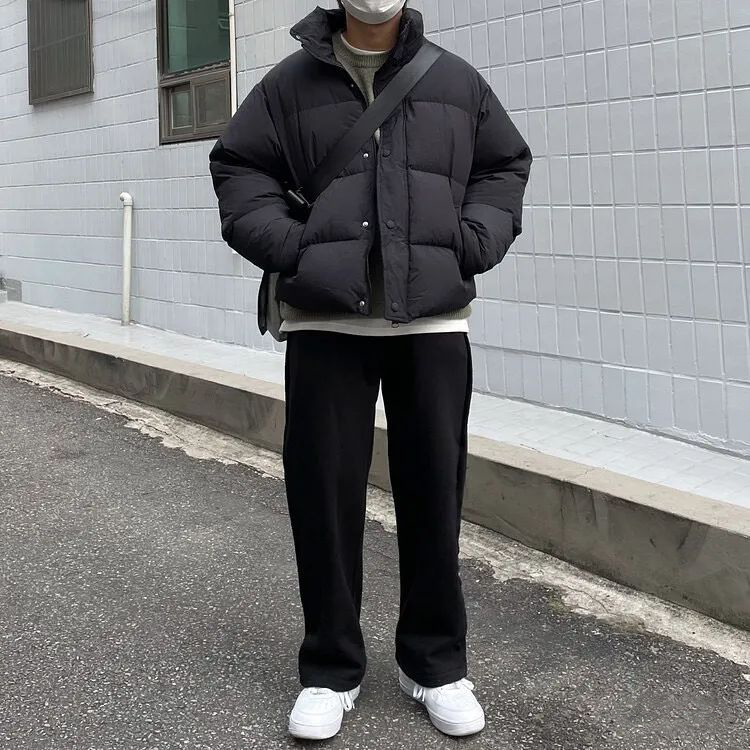 “一身黑”的穿搭,会让男生看起来特别的酷。比如上面这套搭配,黑色的羽绒服搭配黑色的运动裤,里面选择一件灰色的针织衫,可以提亮自己的整体穿搭色调,再穿上百搭的小白鞋呼应。