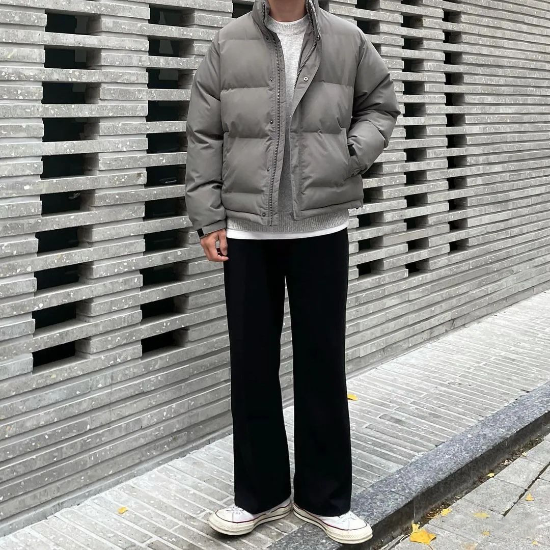 我们可以选择一些短款的羽绒服,比如上面这一件灰色衣服,长度刚好到腰部下面一点,然后里面再搭配一件灰色针织衫,保证上半身衣服色调的统一,也增强了保暖效果。裤子同样选择黑色的休闲裤以及白色的帆布鞋,干净利落显帅气。