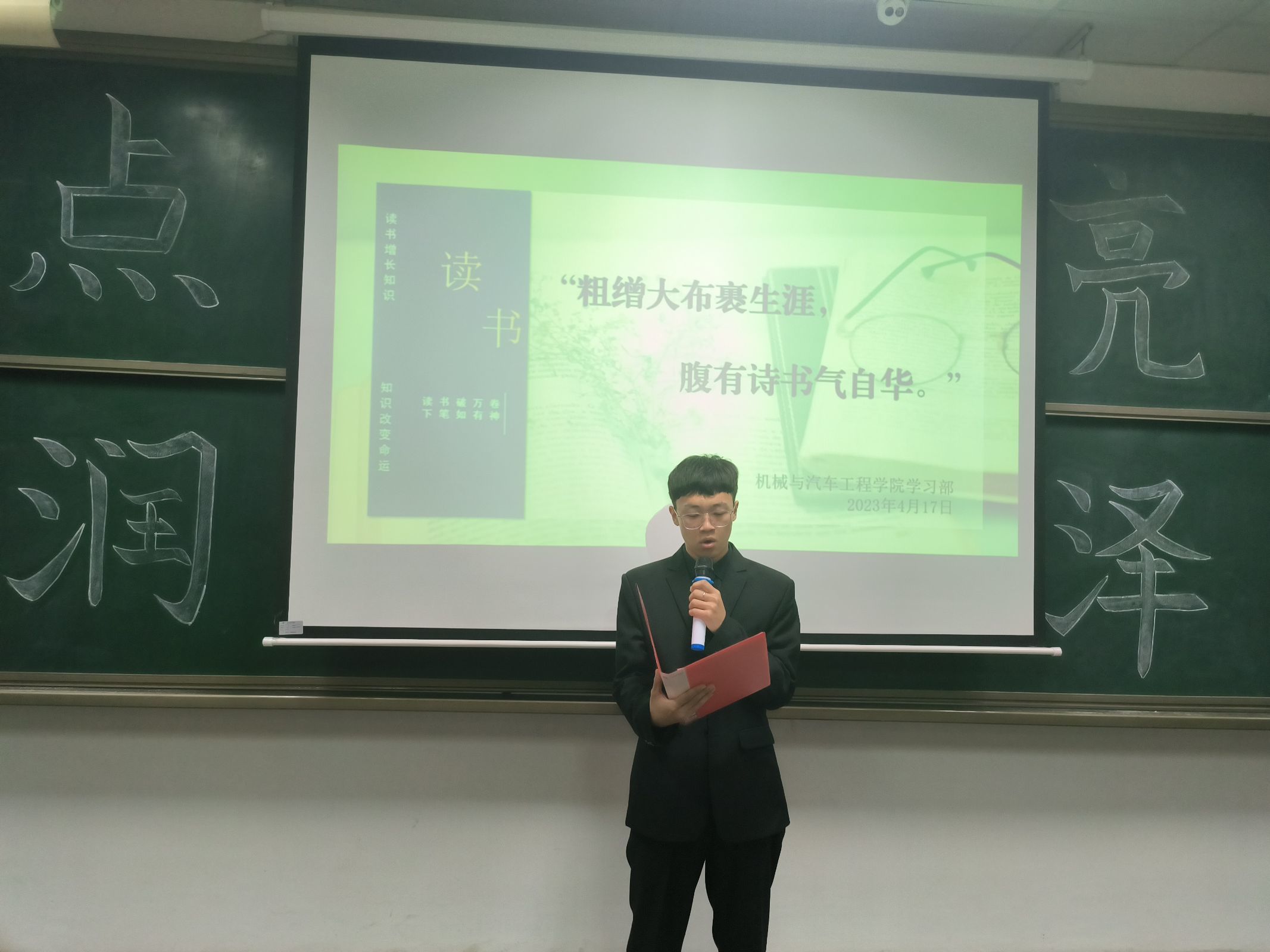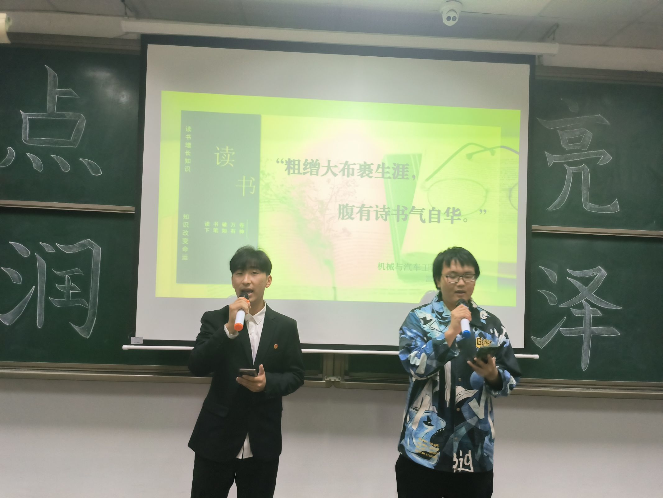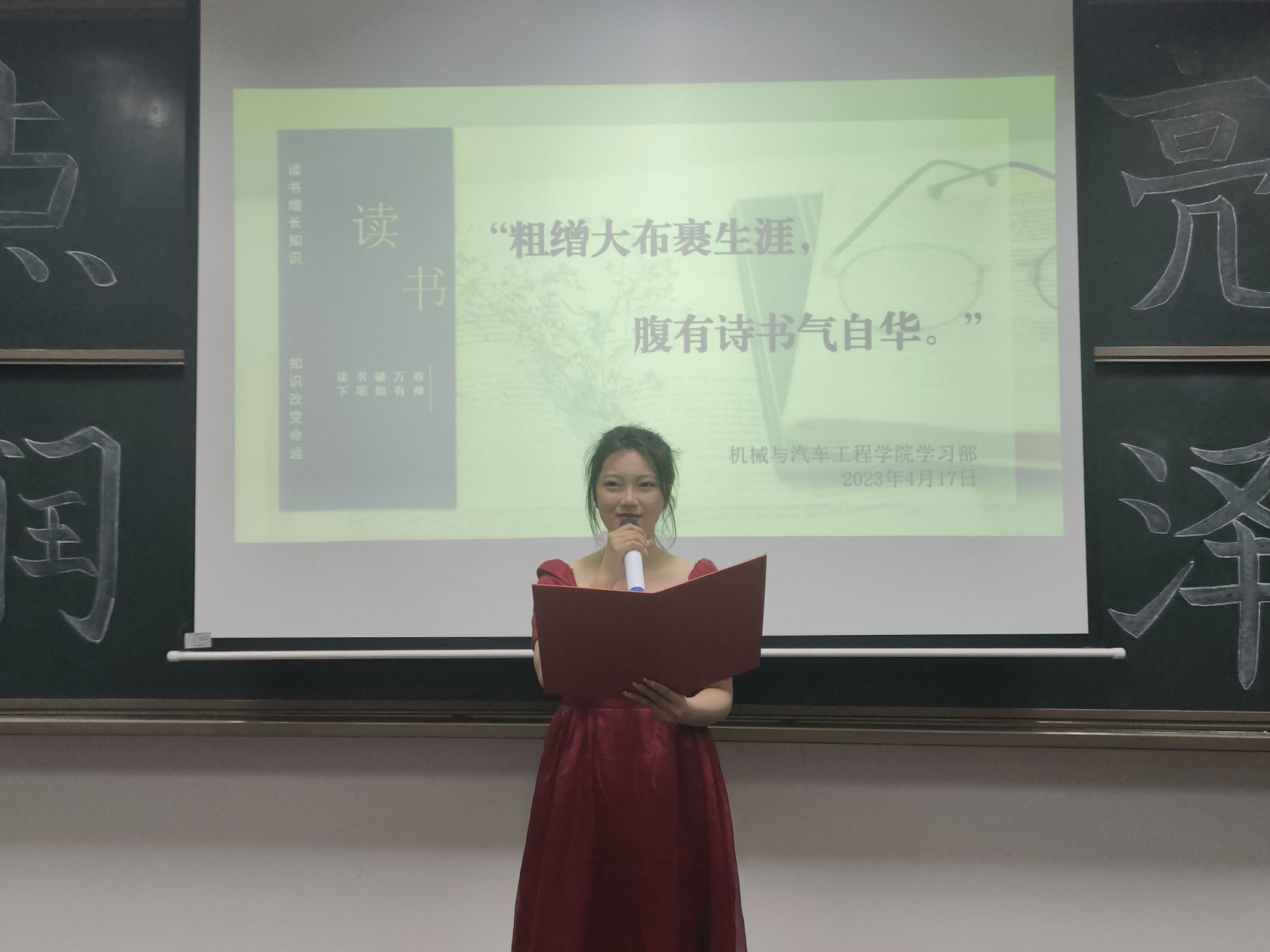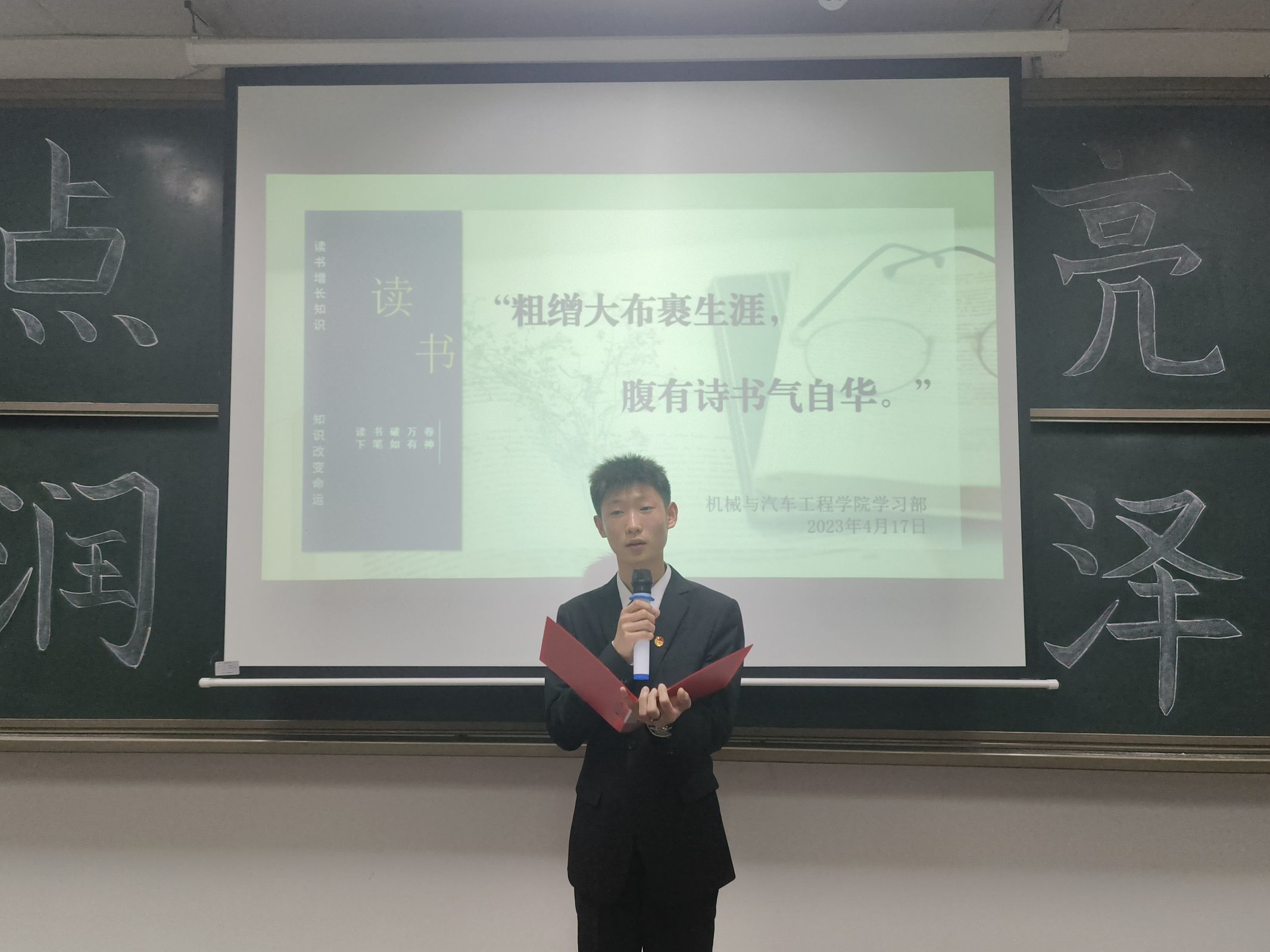 为深入实施素质教育,弘扬与传承传统文化,全面提升学生的文学素养、综合素质,培养同学们多读书、读好书的良好习惯,机械与汽车工程学院特于4月17日A4-808教室举办了“读书点亮心灵,书香润泽人生”朗诵比赛。