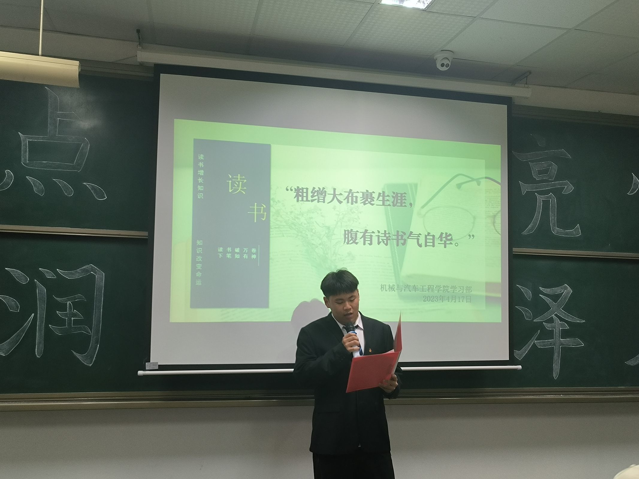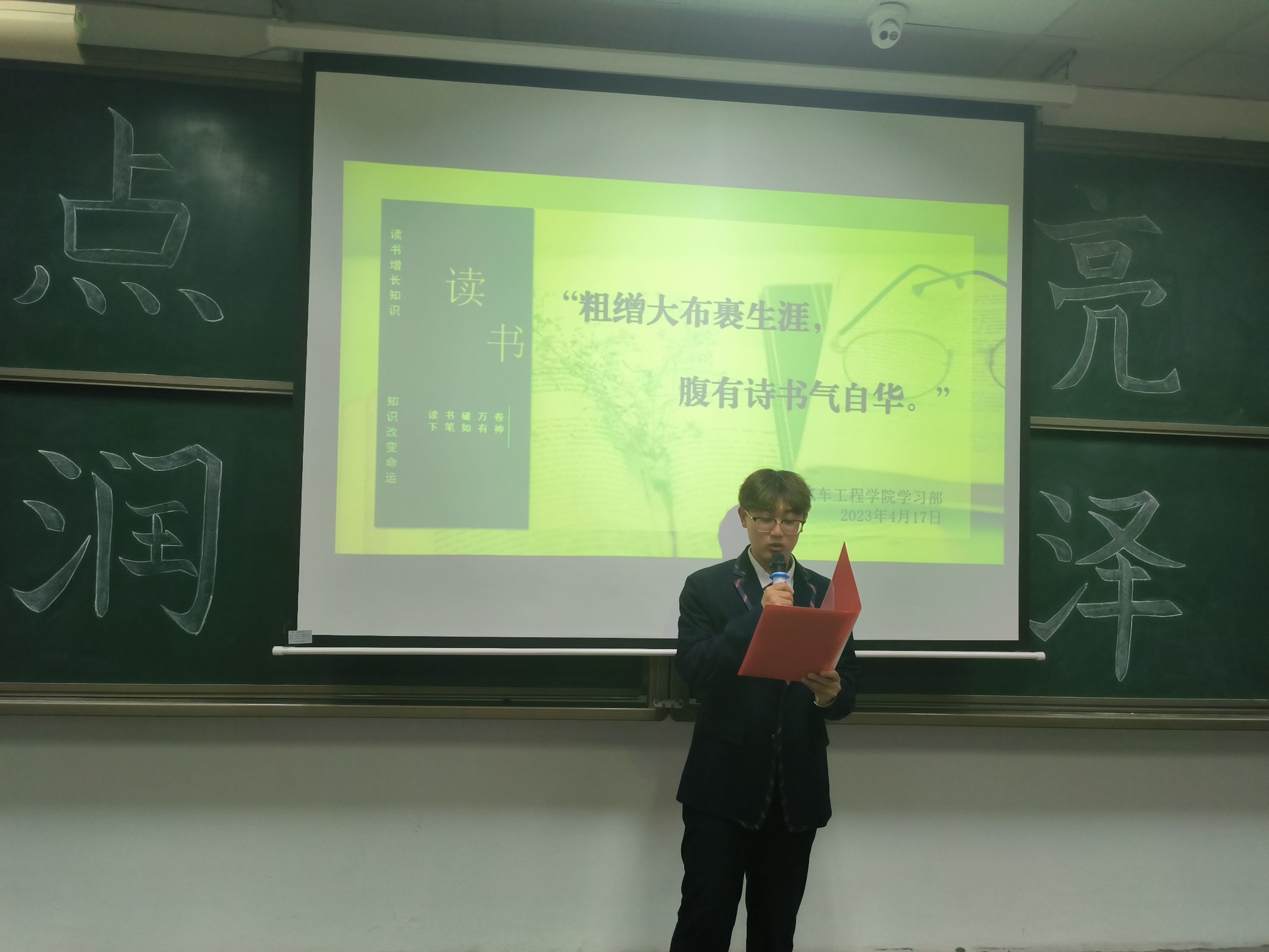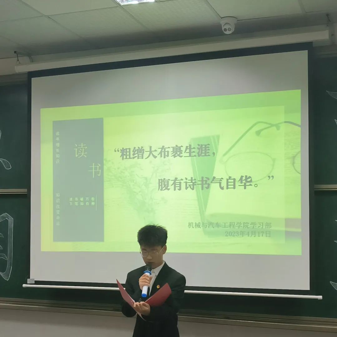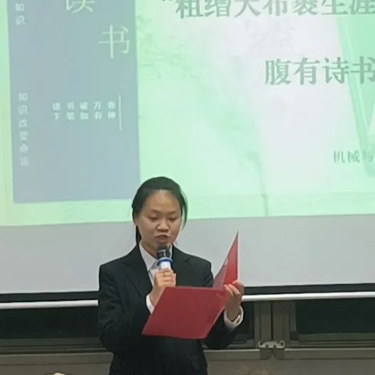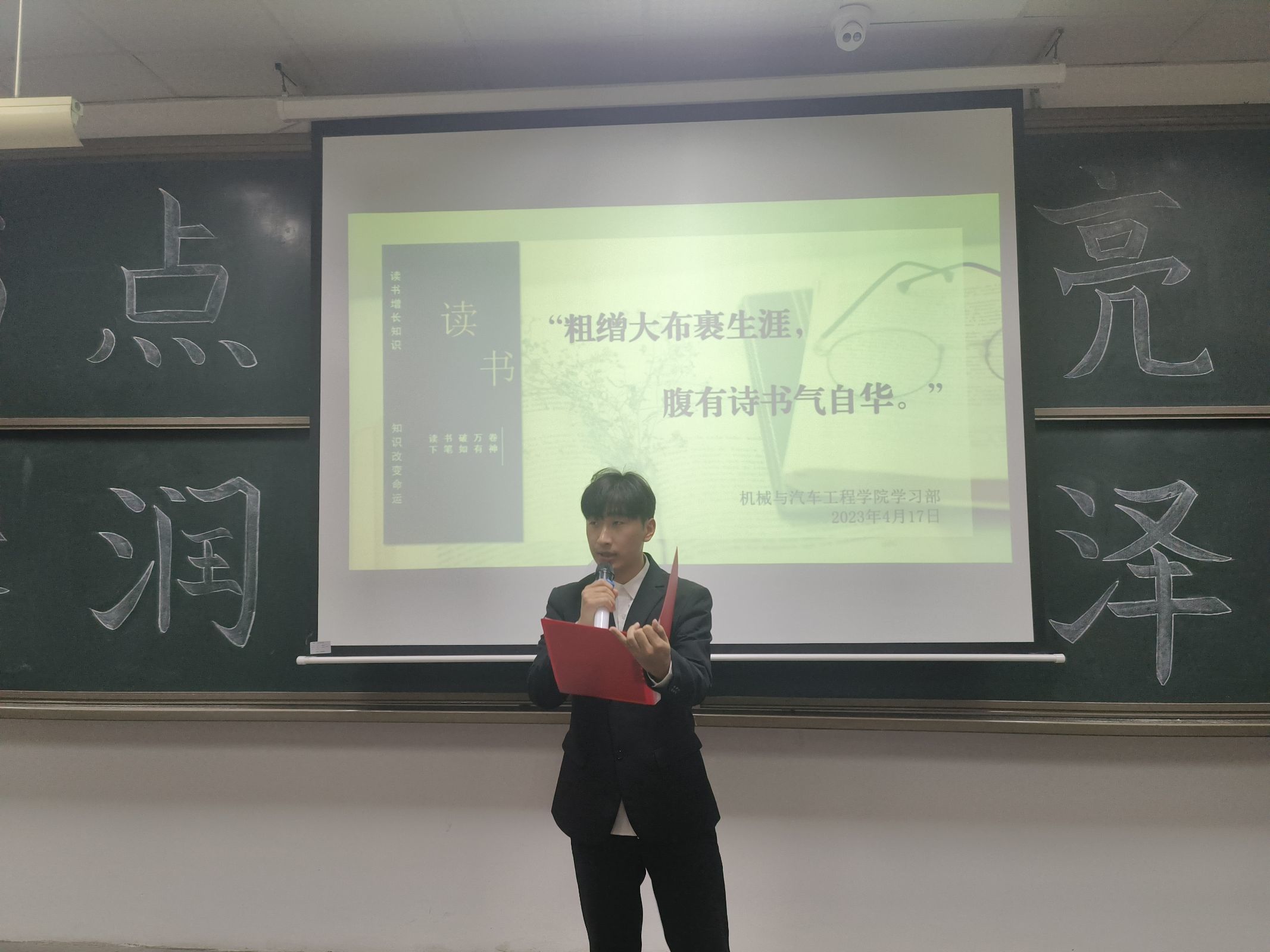 为深入实施素质教育,弘扬与传承传统文化,全面提升学生的文学素养、综合素质,培养同学们多读书、读好书的良好习惯,机械与汽车工程学院特于4月17日A4-808教室举办了“读书点亮心灵,书香润泽人生”朗诵比赛。