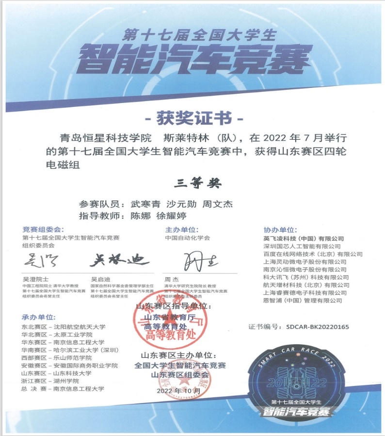 机械与汽车工程学院于2022年7月21日—23日组织学生参加了第十七届全国大学生智能汽车竞赛,最终机械与汽车工程学院的参赛选手获得了省级三等奖1项的优异成绩。