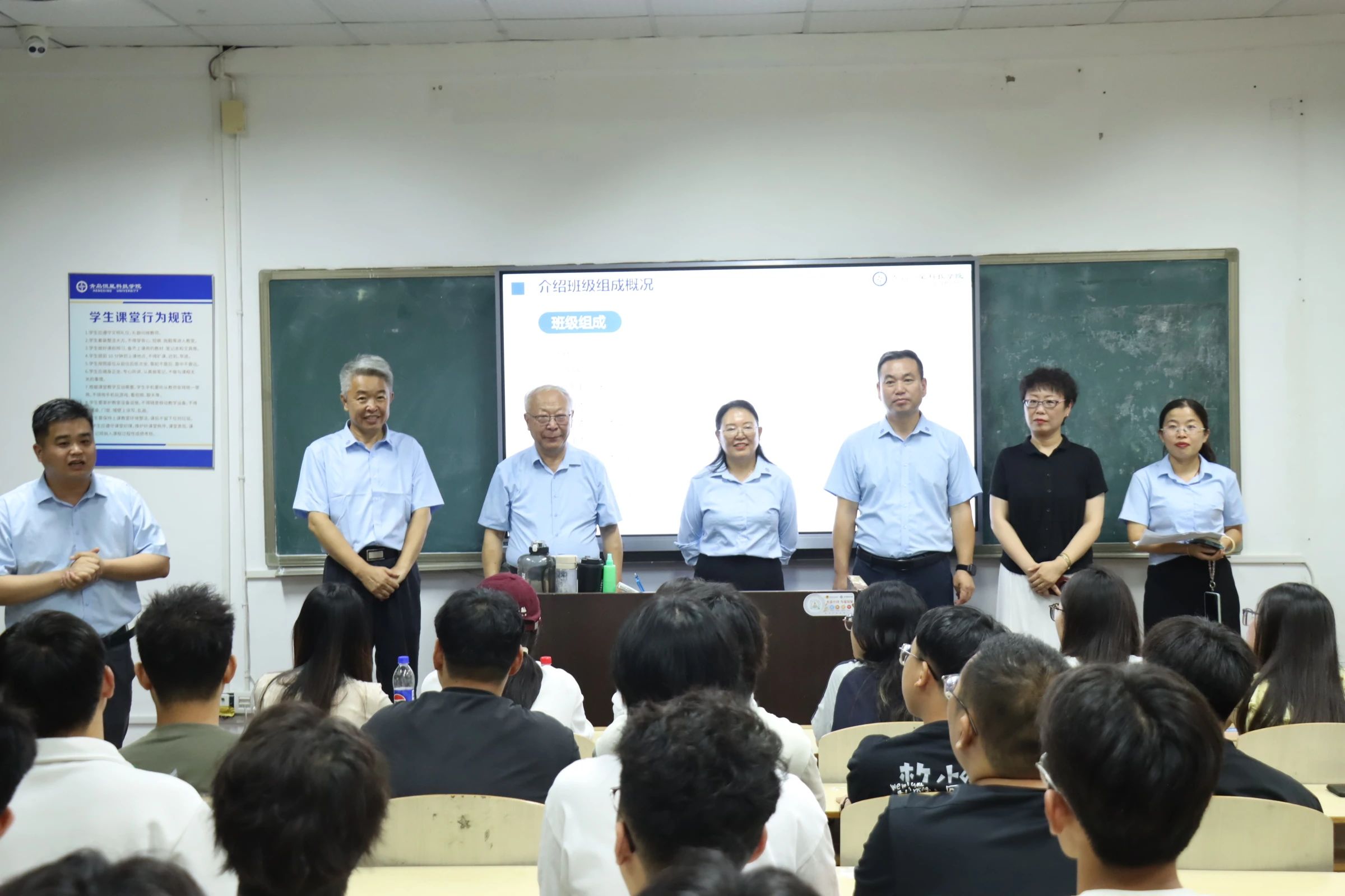 青岛恒星科技学院校执行校长徐爱民,校办公室主任刘卓,机械与汽车工程学院名誉院长常德功、执行院长姜培刚、党总支书记马宝同、教学院长修霞、智能装备行业院长庄新颖以及党总支副书记张家一等一行亲临现场,为新生送上殷切期许。徐校长热情介绍学院作为学校"王牌院系"的三大优势:规模最大、师资最强、实训条件最优,被誉为"工程师摇篮"。他勉励新生:"既要夯实专业技能根基,更要胸怀远大志向"。行业院长庄新颖着重阐释"双师型"师资特色——教授学者与行业专家联袂执教,为培养新时代工程师筑牢根基。