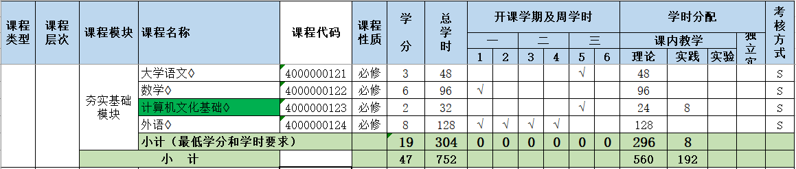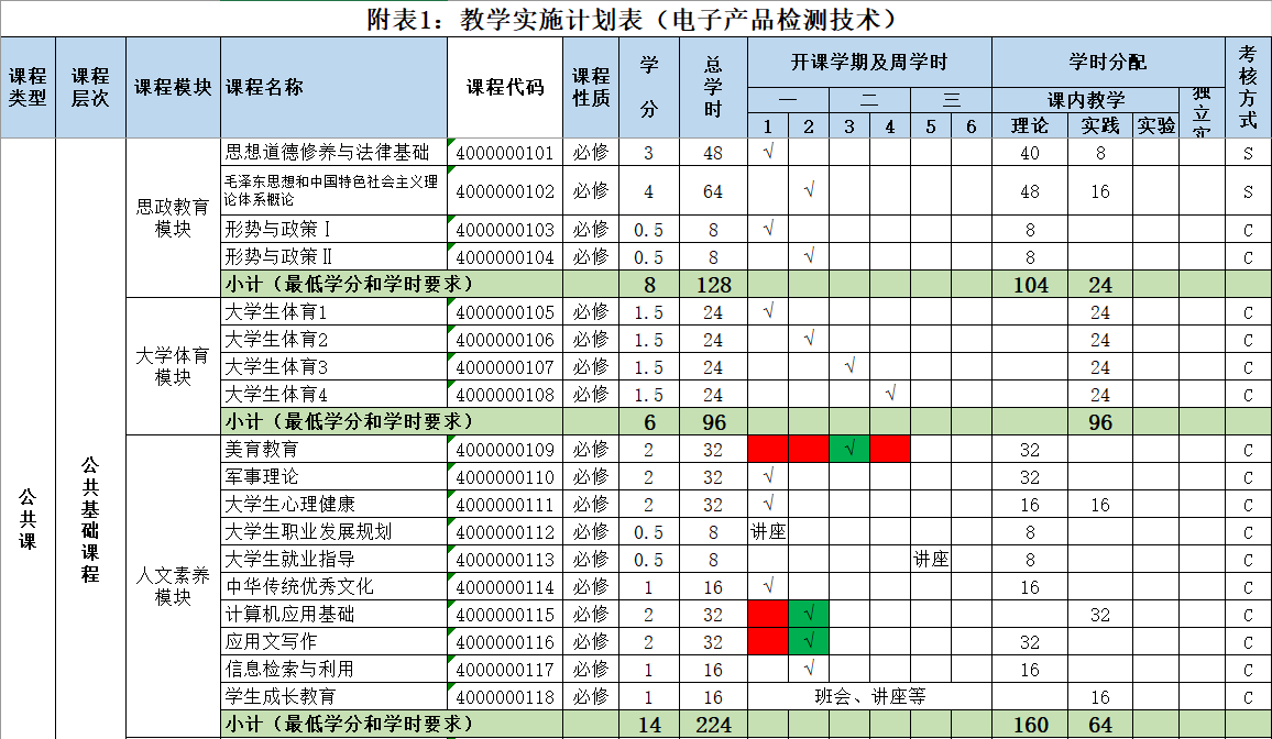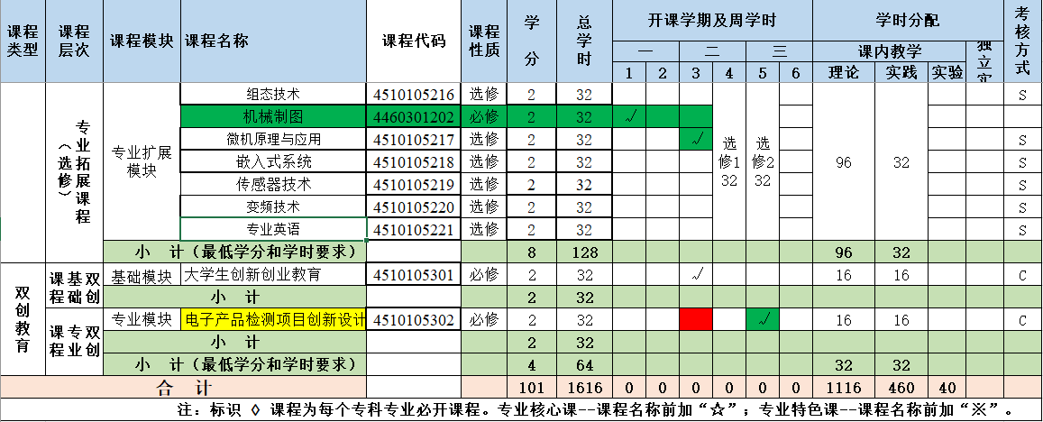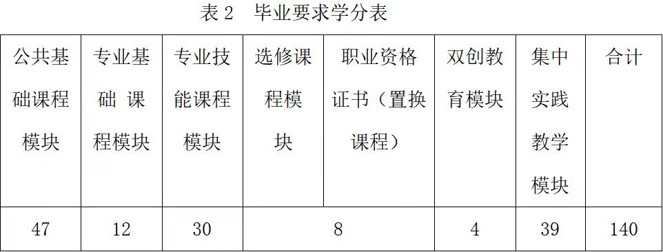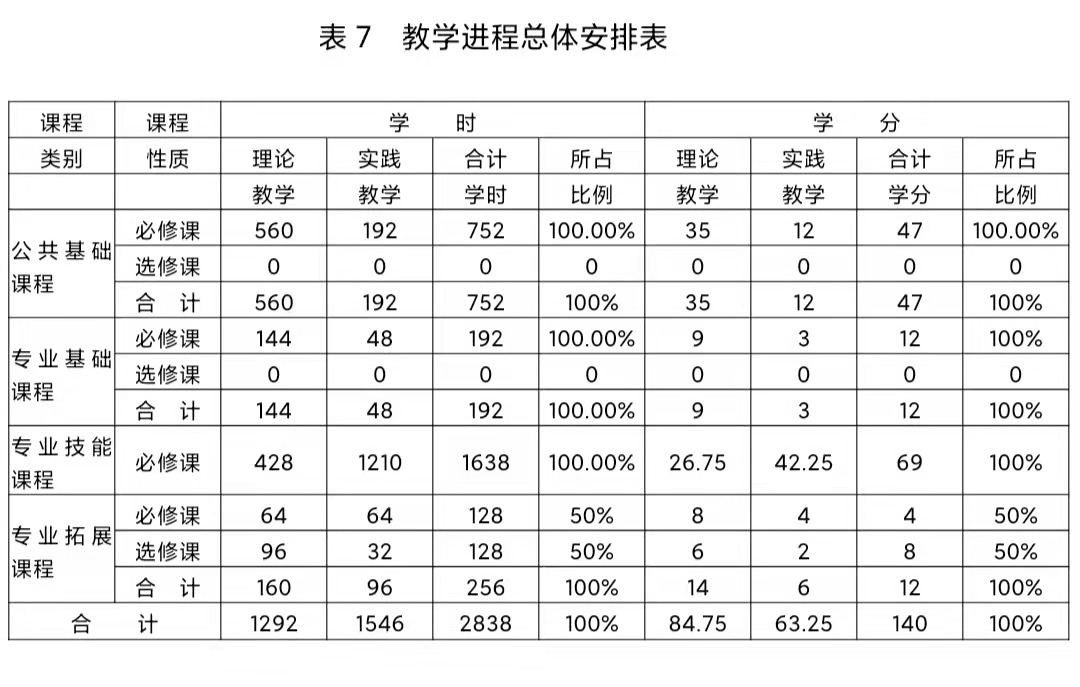 本专业课程主要包括公共基础课程、专业课程和双创教育课程。专业课程包括专业基础课程、专业核心课程、专业拓展课程(选修),并覆盖有关实践性教学环节,具体学时安排见附表教学实施计划表。