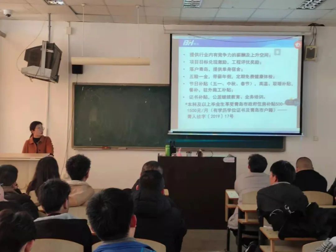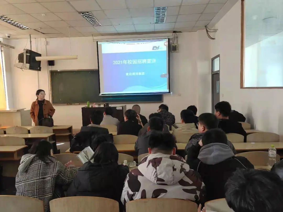 宣讲过程中,企业负责人带着准备充分的宣讲ppt及企业实景视频,从企业背景、企业文化、人才培养、薪金待遇等方面为同学们详细介绍了青岛博海集团,让同学们充分了解到企业信息,并极力邀请学生未来选择自己的企业。