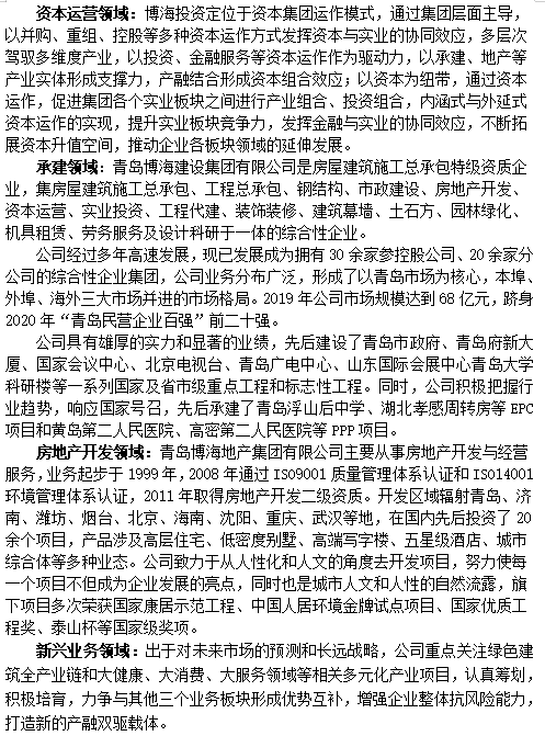 青岛博海集团是以建筑工程和房地产开发为主要产业投资的现代民营企业。旗下主要企业:青岛博海投资有限公司、青岛博海建设集团有限公司、青岛博海地产集团有限公司、青岛零零一工程有限公司等共计30余家参控股企业。产业投资分为承建业务、房地产开发业务、资本运营业务、新兴业务四大板块,集团秉承专业化为主,多元化为辅的发展思路,积极打造承建+地产的双主业模式,将产业链系统整合,统筹运作,统一管理,同时加大资本运营力度,培育新兴高效附属产业,资本运营板块为承建、地产业务提供资金支持,利用地产带动工程承建,工程承建促进地产快速发展,形成承建、地产、资本运营、新兴产业发展矩阵。