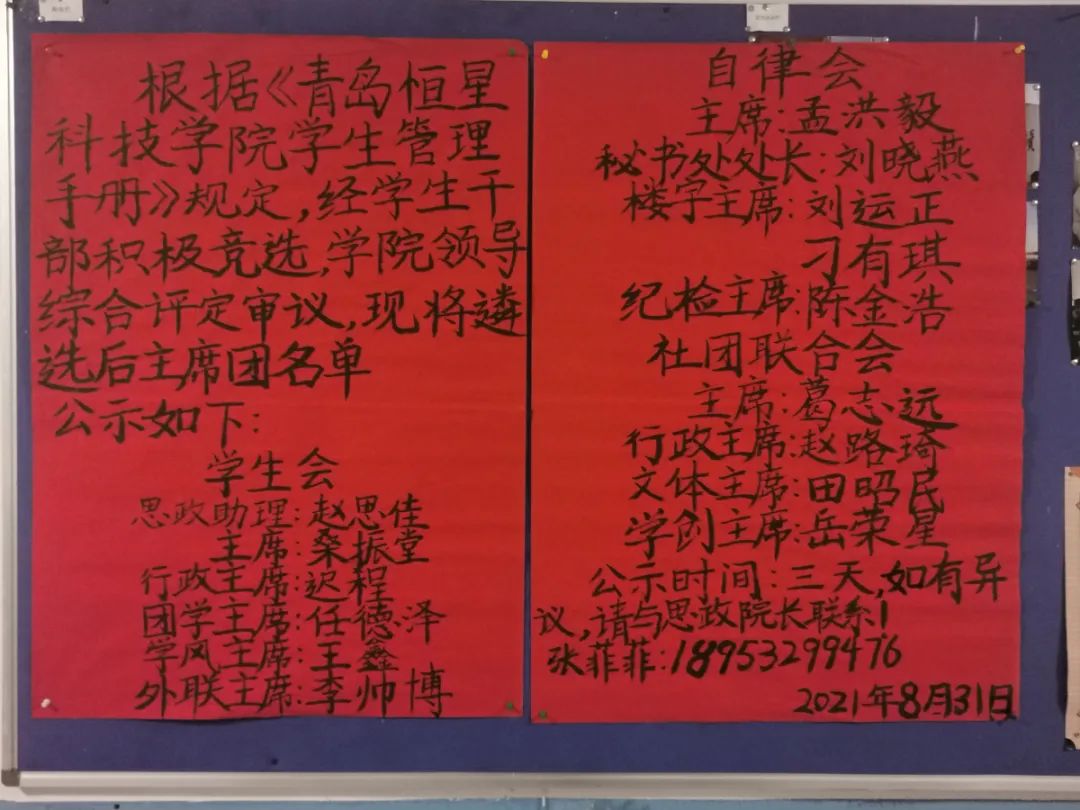 为了更好的开展学生工作,加强工学院学生会管理,青岛恒星科技学院工学院主席团进行了换届选举,此次竞选遵循公平公正公开的原则,经过自主报名、综合能力资格审查、公开竞选等环节,经工学院思政院长张菲菲和各辅导员的审议,选拔确定工学院学生会主席团、自律会主席团以及社团联合会主席团。